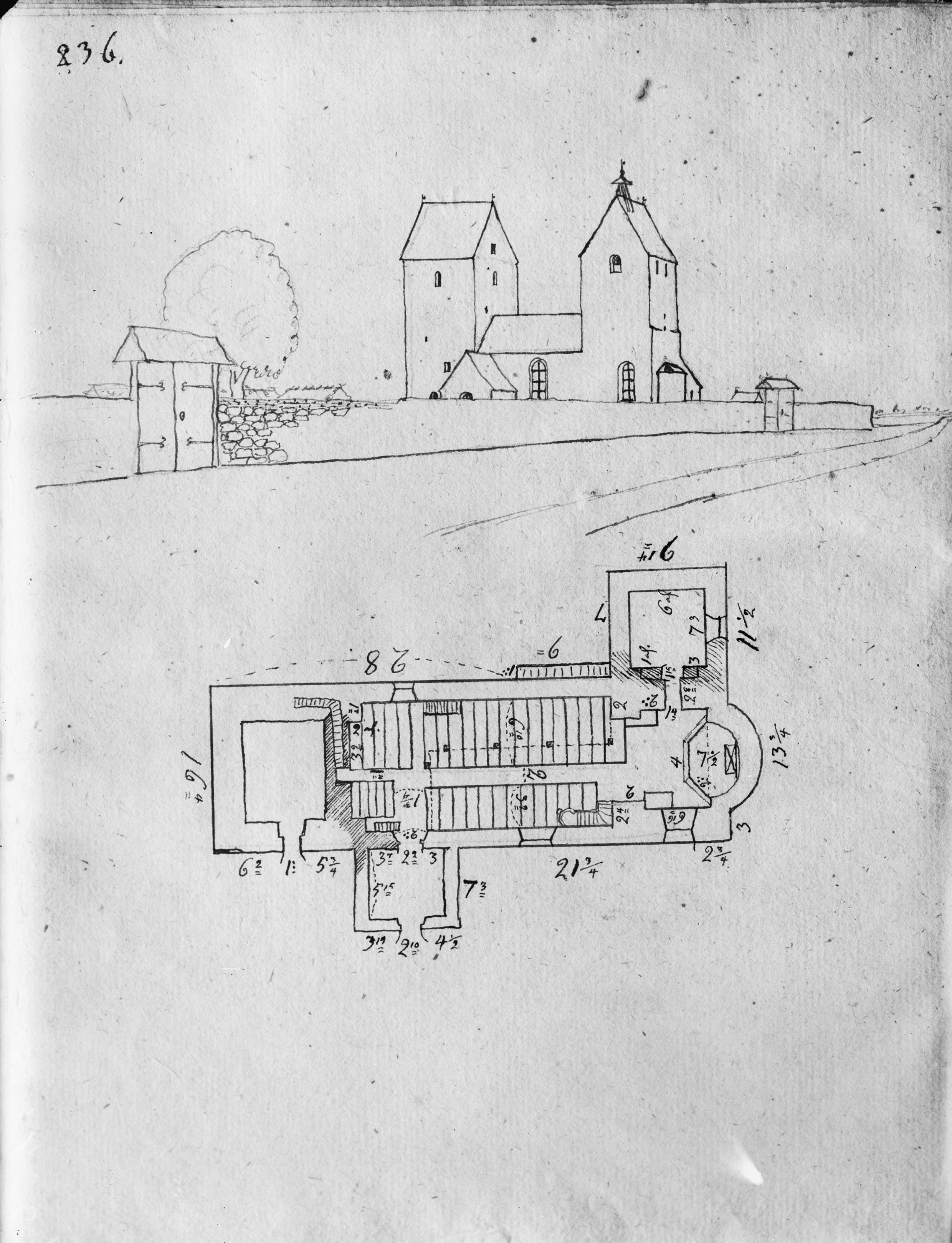 Beskrivning: Teckning av kyrkan, fasad och plan. Ur Löfgrens anteckningar.
