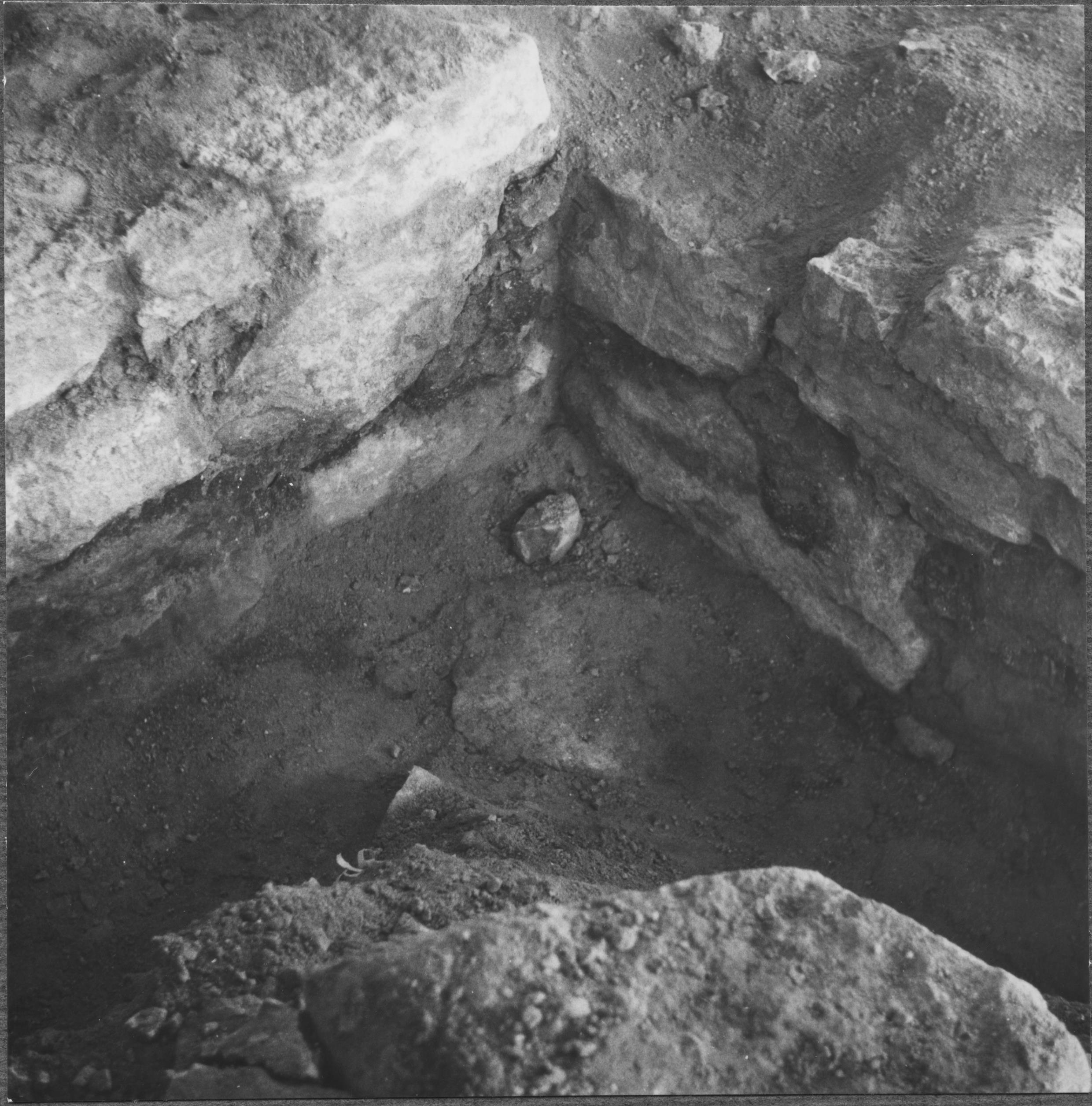 Beskrivning: Utgrävning i kyrkan. Hörn mellan långhus och triumfbågsmur, i NO.