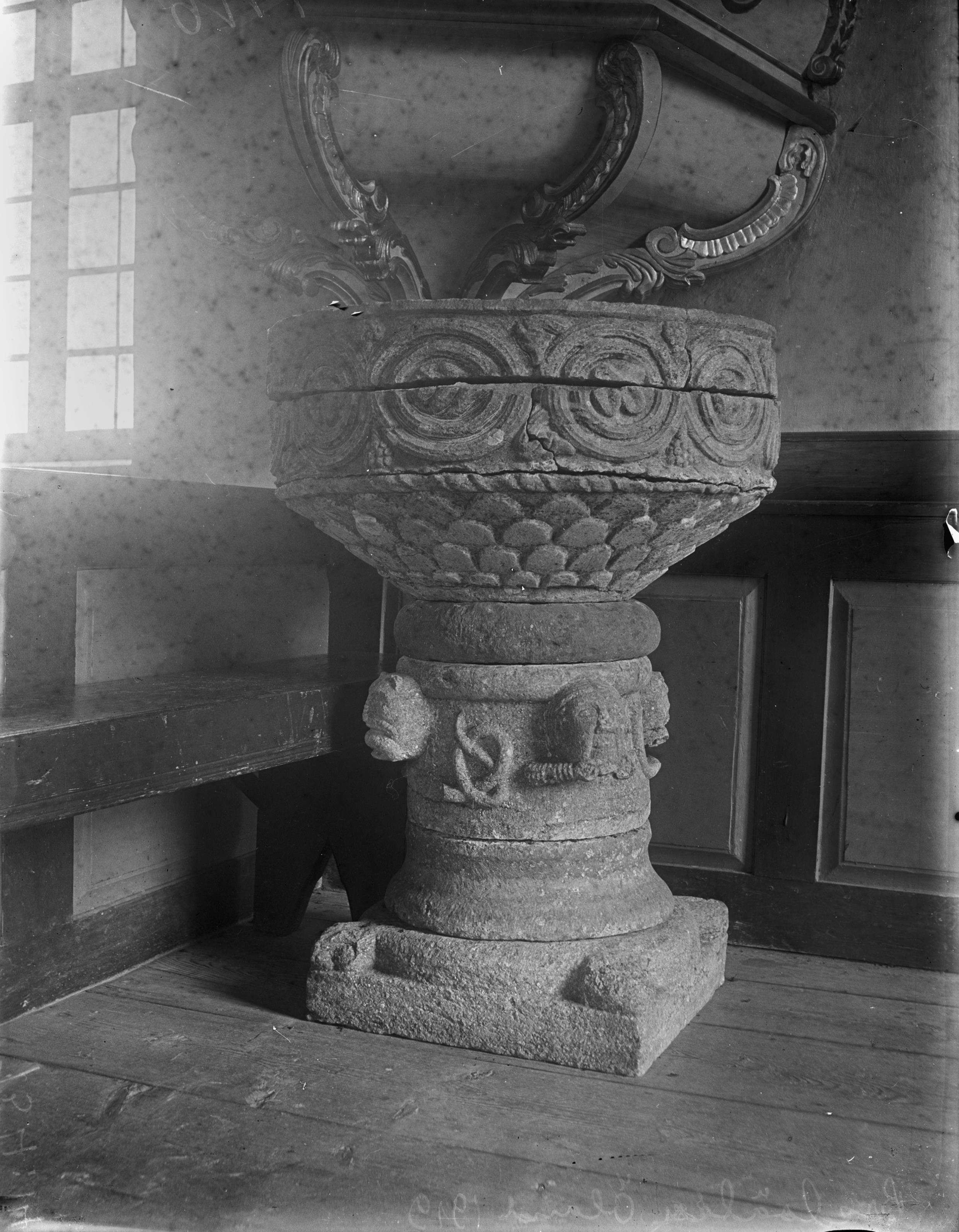 Beskrivning: Dopfunt av sandsten från medeltiden.
