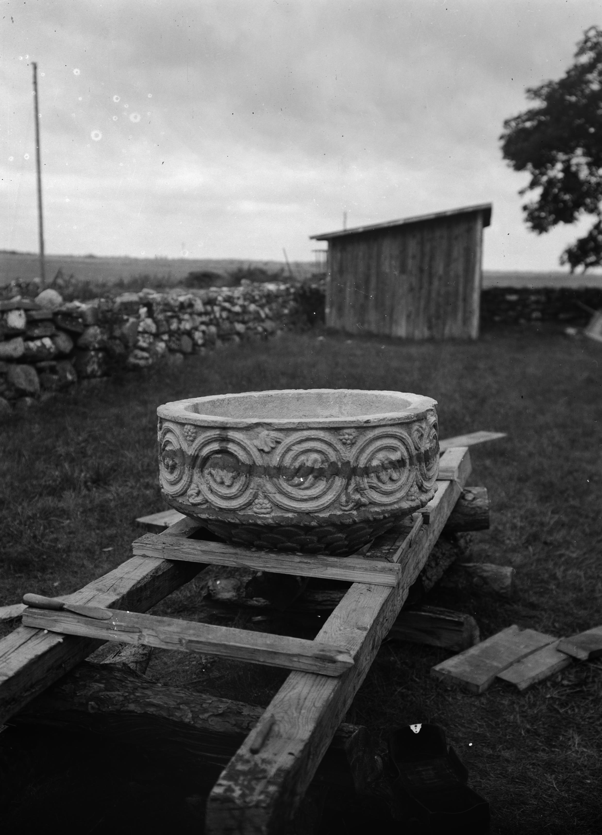 Beskrivning: Dopfunt av sandsten från medeltiden, under restaurering.
