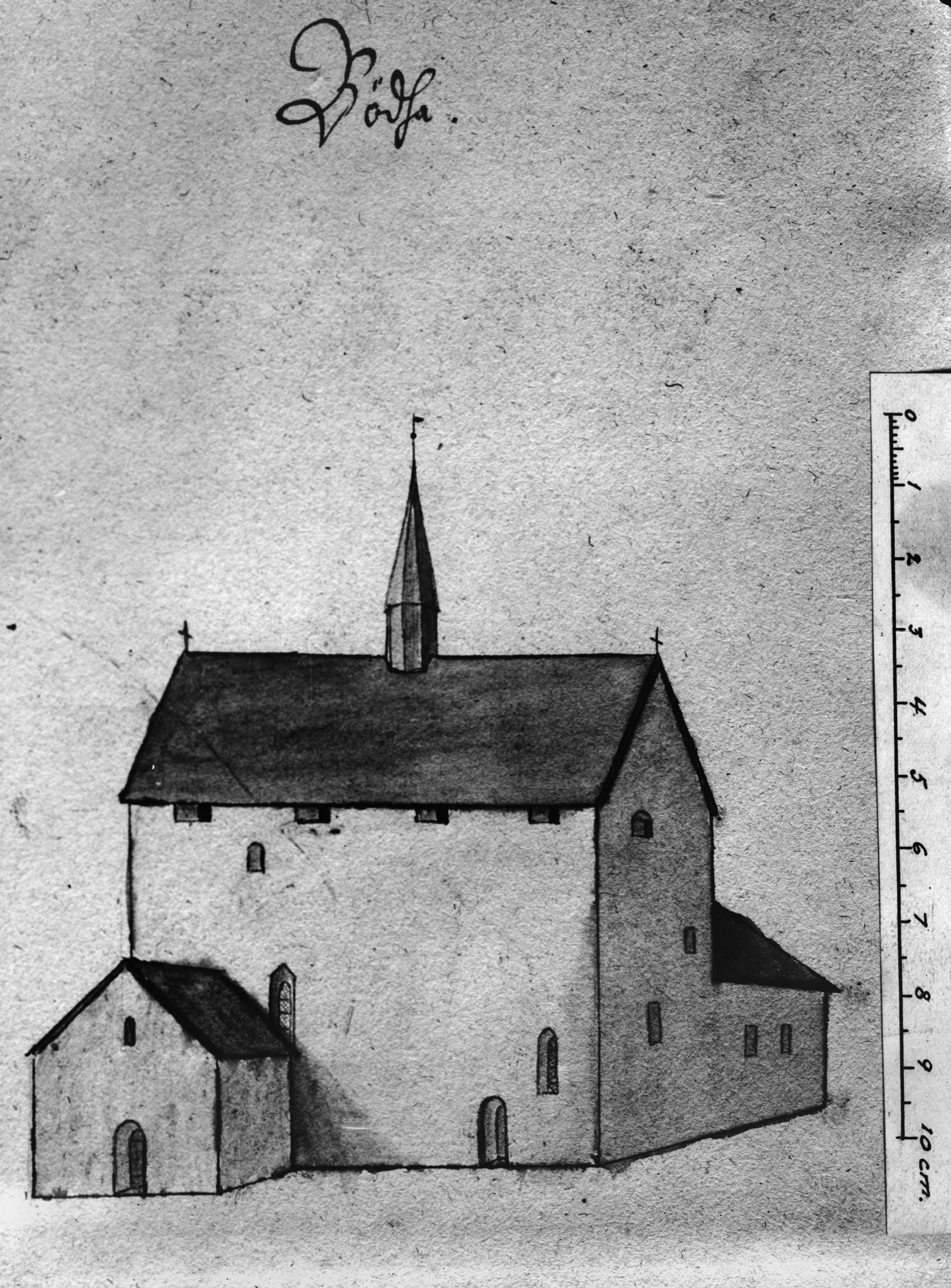Beskrivning: Teckning av kyrkan från söder, ur Archivum Smolandium av S. L. Gahm.