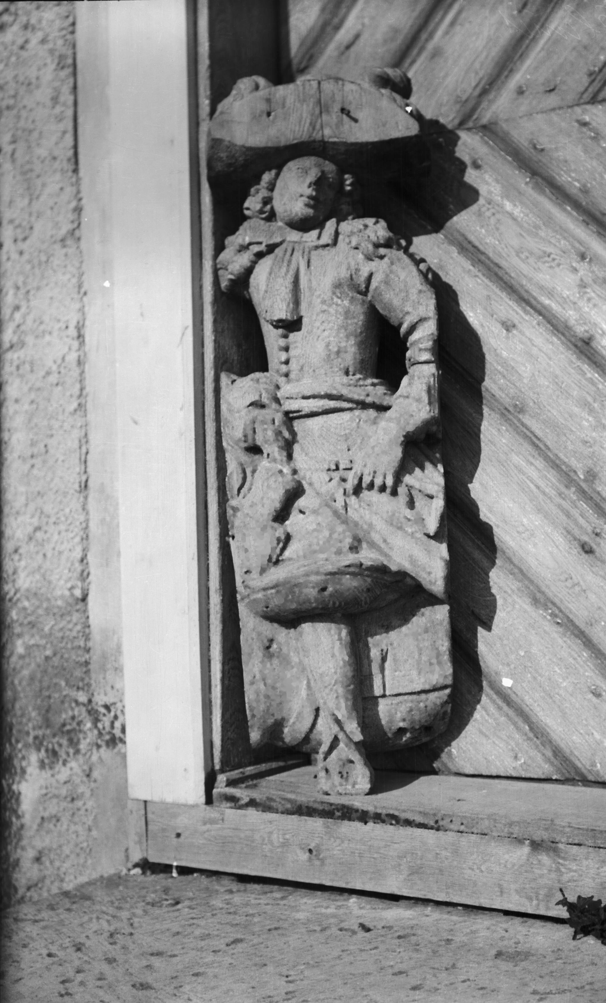 Beskrivning: Skulptur i trä föreställande mittparti av ryttarfigur.