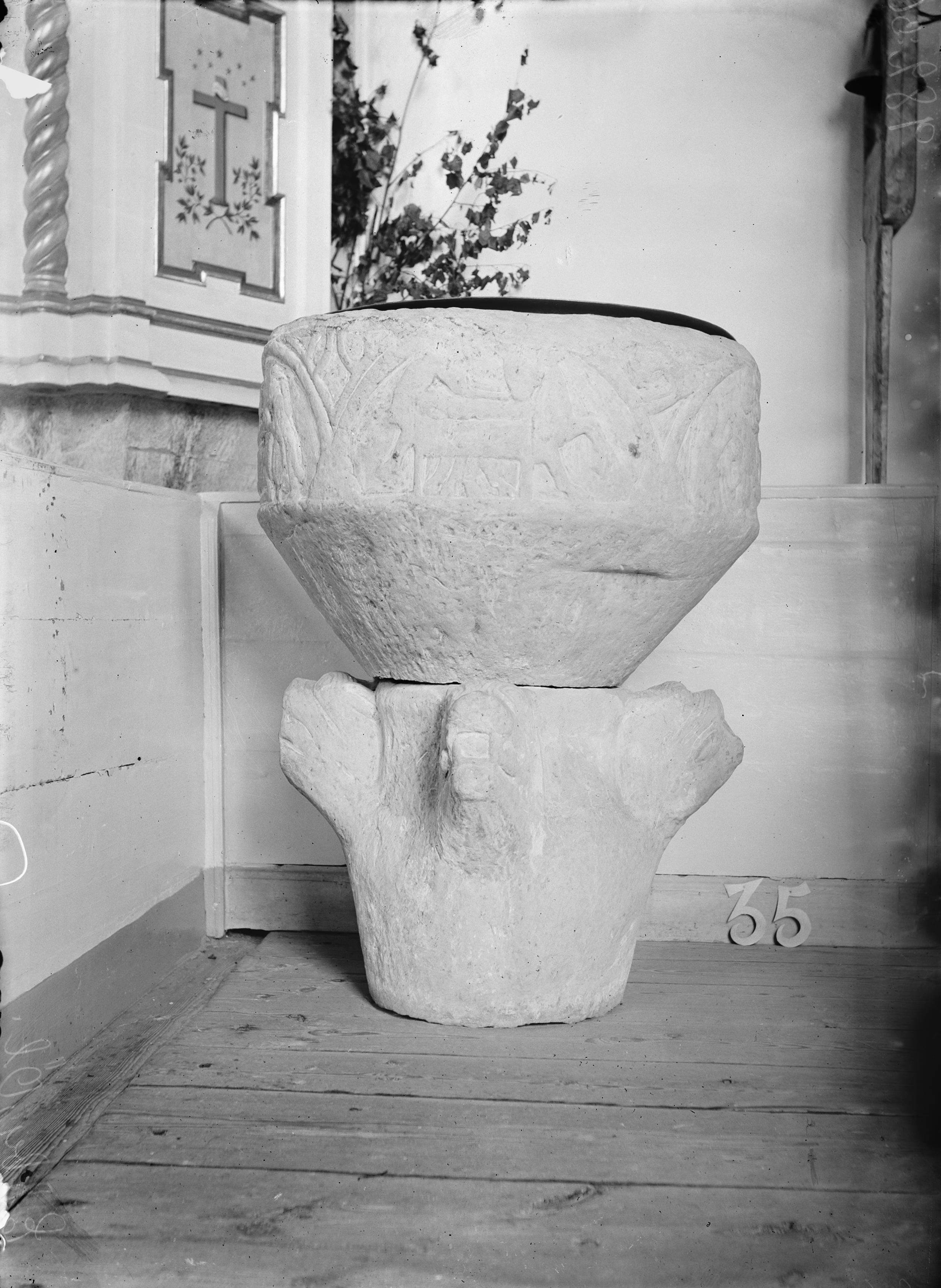 Beskrivning: Dopfunt från medeltiden av grå sandsten.