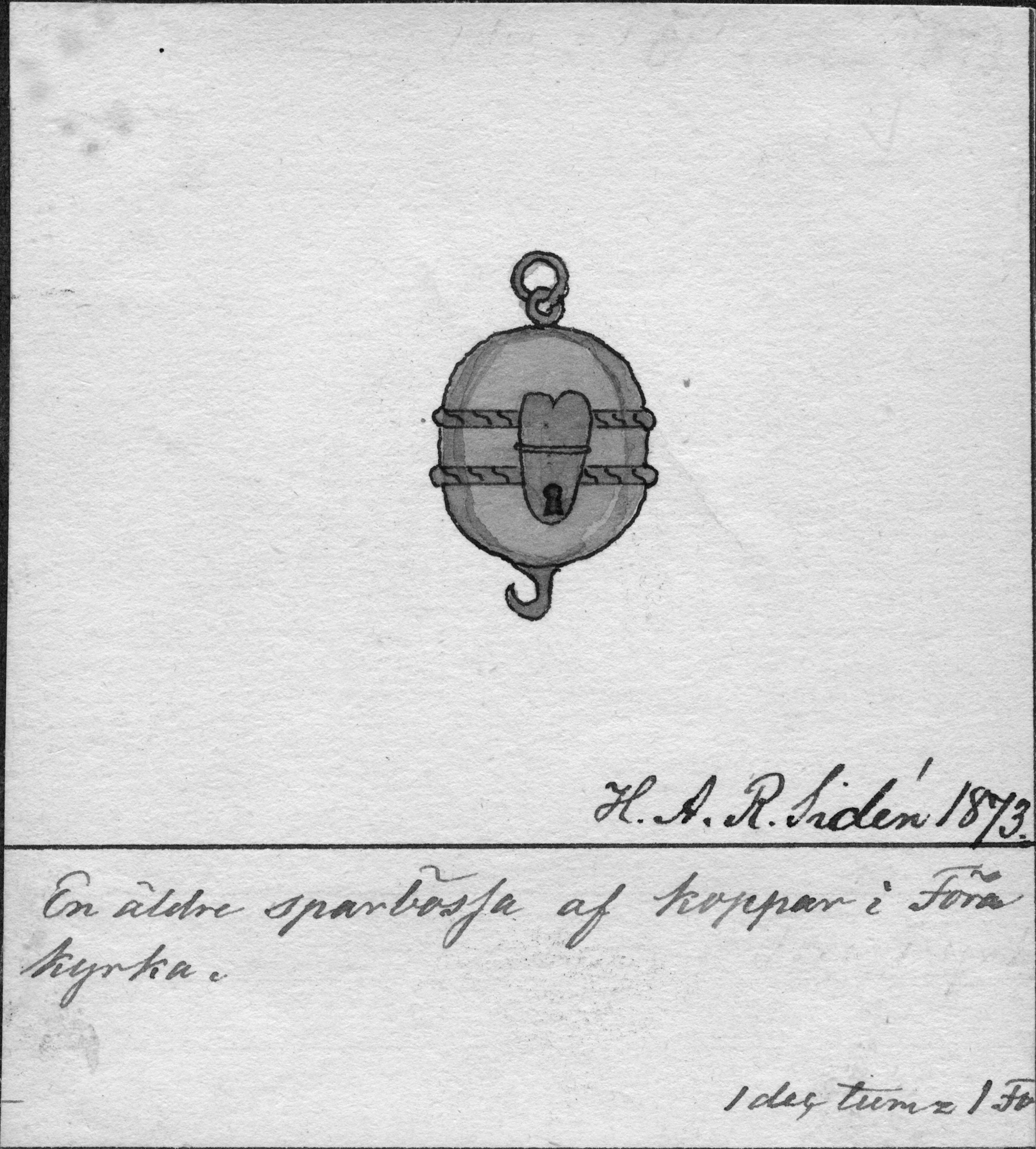 Beskrivning: Teckning föreställande sparbössa av koppar, av H. A. R. Sidén 1873.