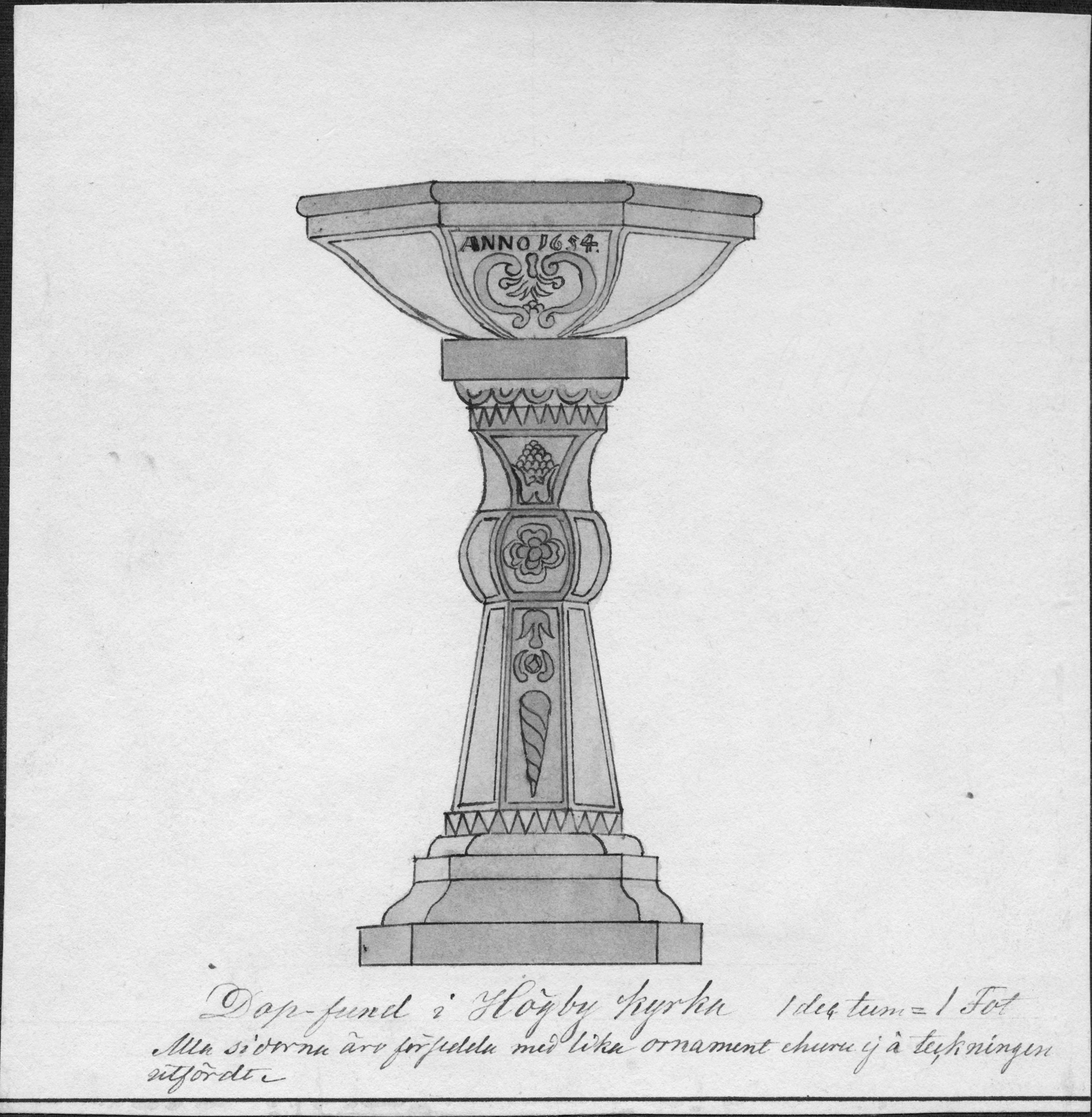 Beskrivning: Dopfunt av röd kalksten från 1954. Teckning av H. A. R. Sidén 1873.