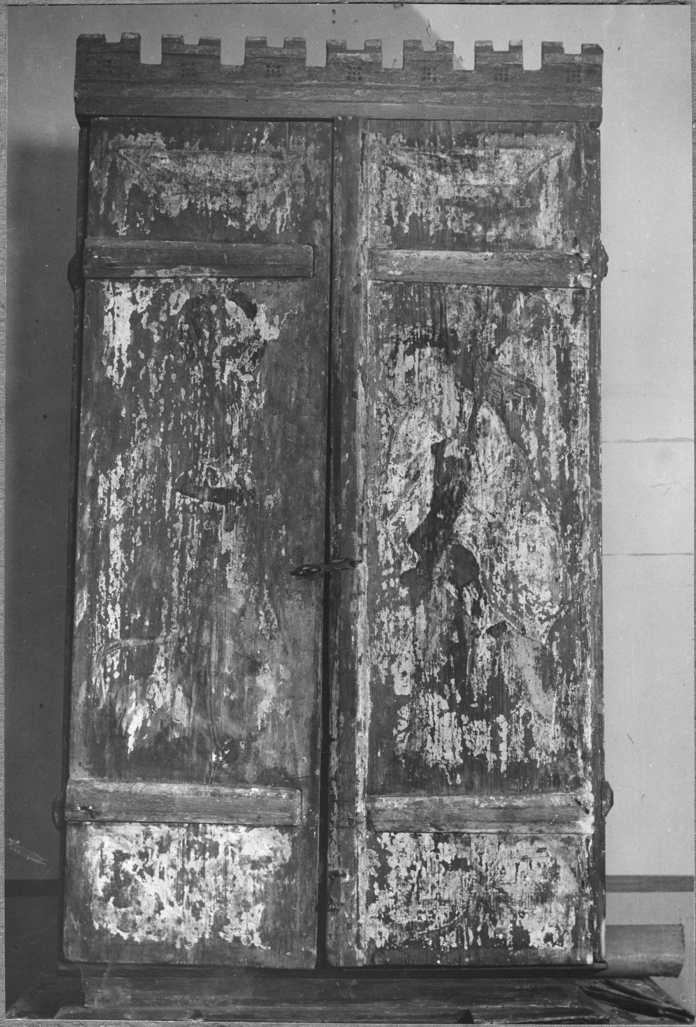 Beskrivning: Mariaskåpet efter konservering med stängda dörrar. På högra dörren fragment av Kristoffer med grönskande stav