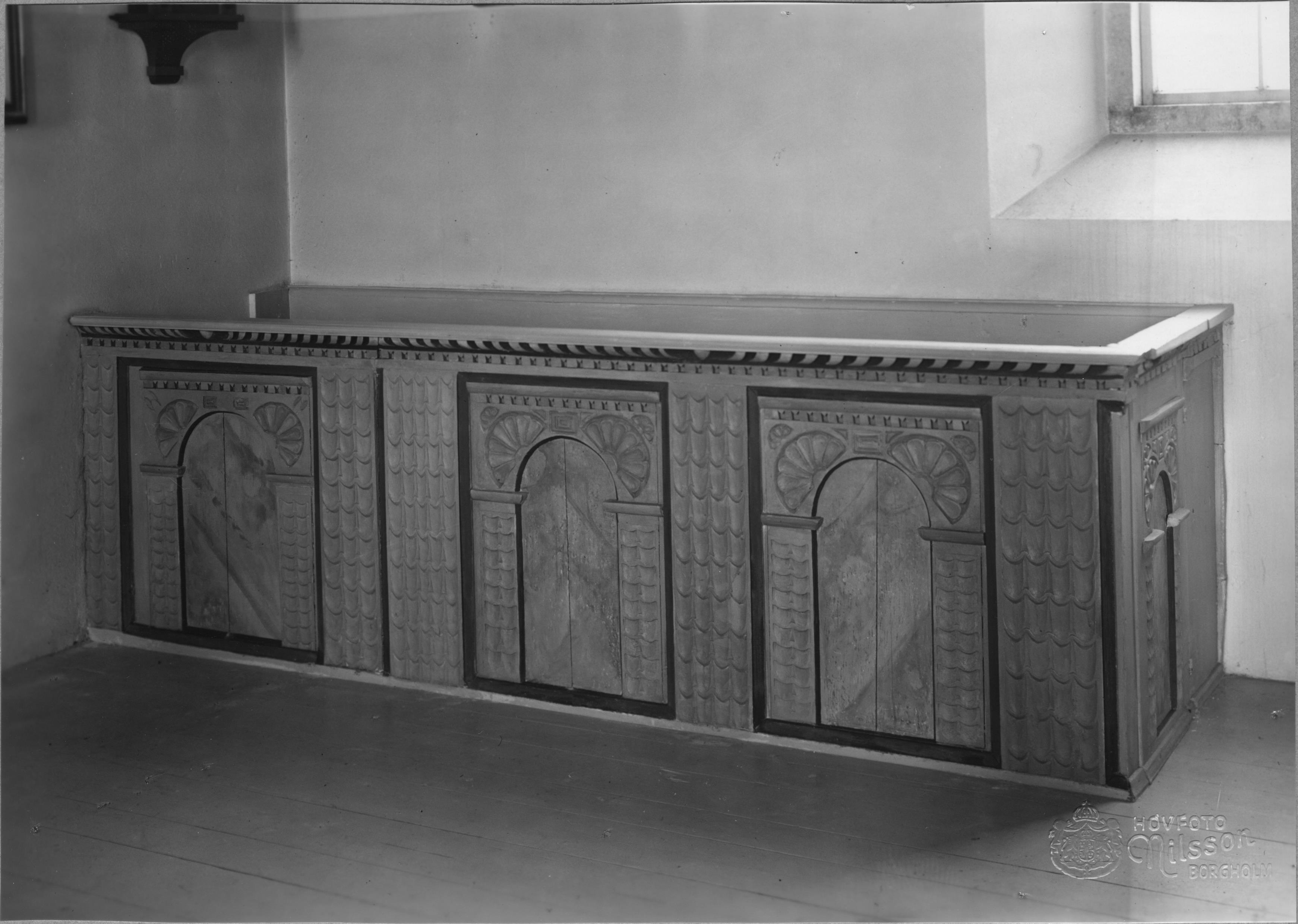 Beskrivning: Den så kallade biskopsbänken från 1654, efter restaurering.