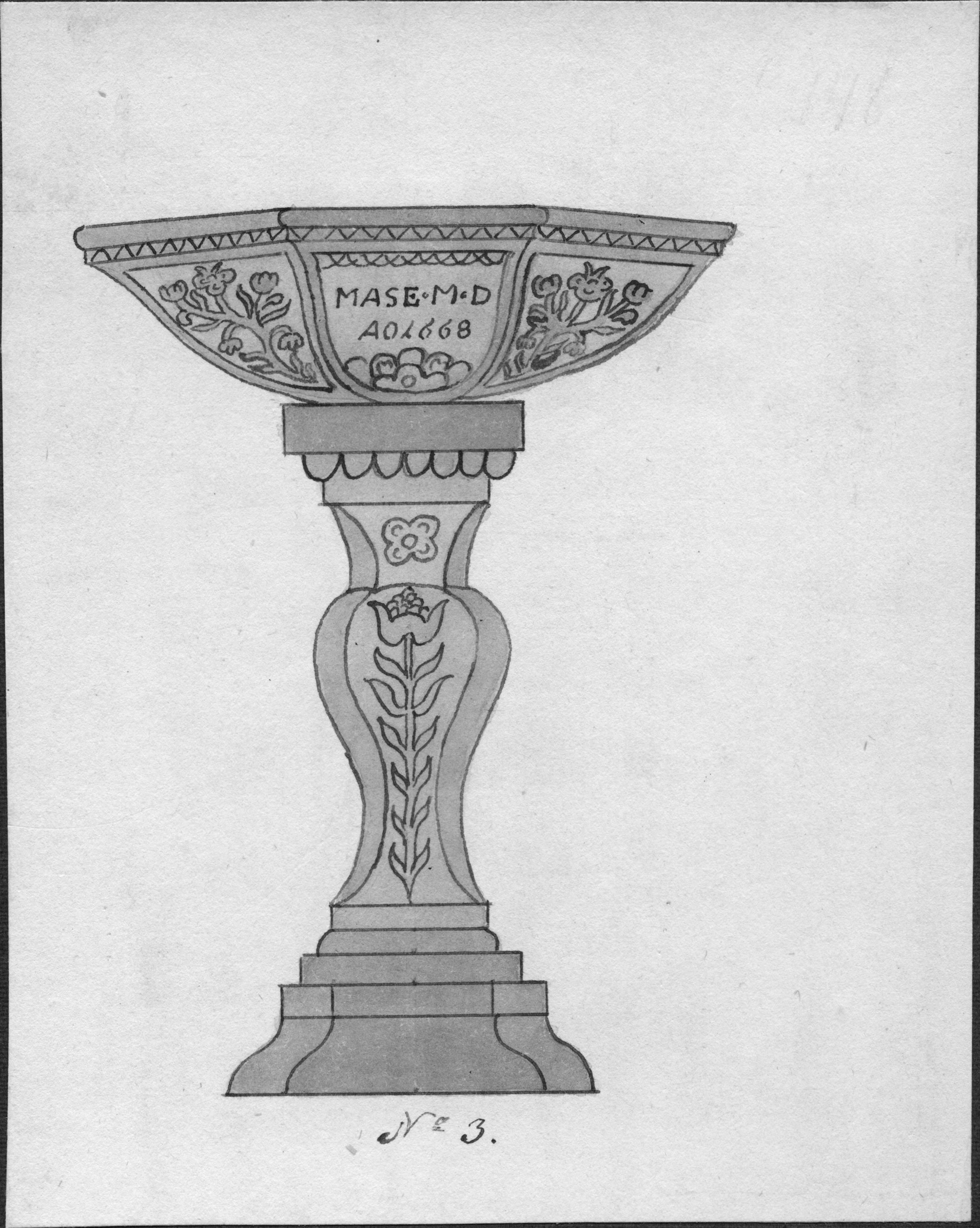 Beskrivning: Teckning av dopfunt av röd kalksten från 1668. Teckning av H. A. R. Sidén 1873.