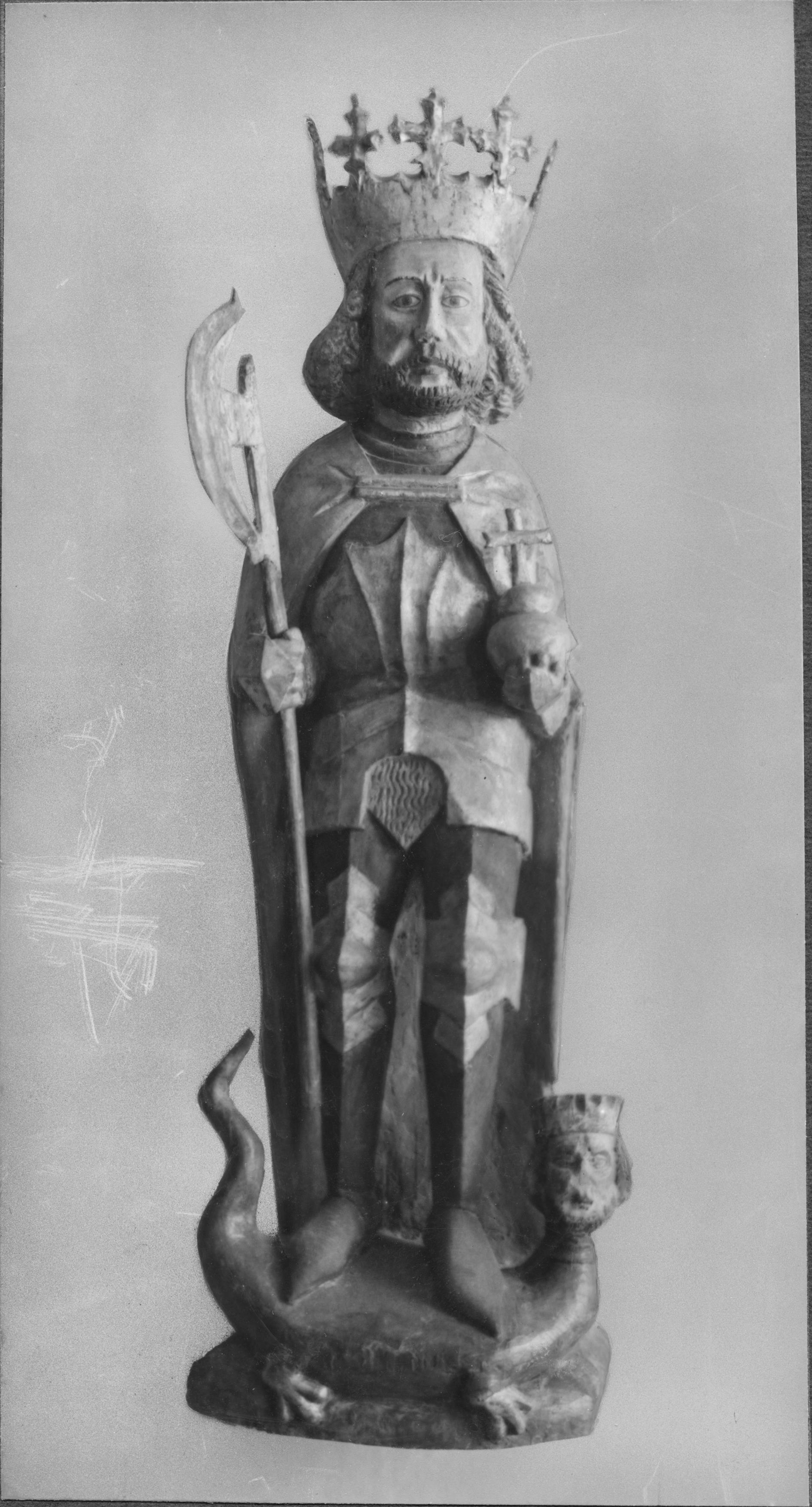 Beskrivning: Träskulptur till altarskåpet föreställande S:t Olof efter restaurering.