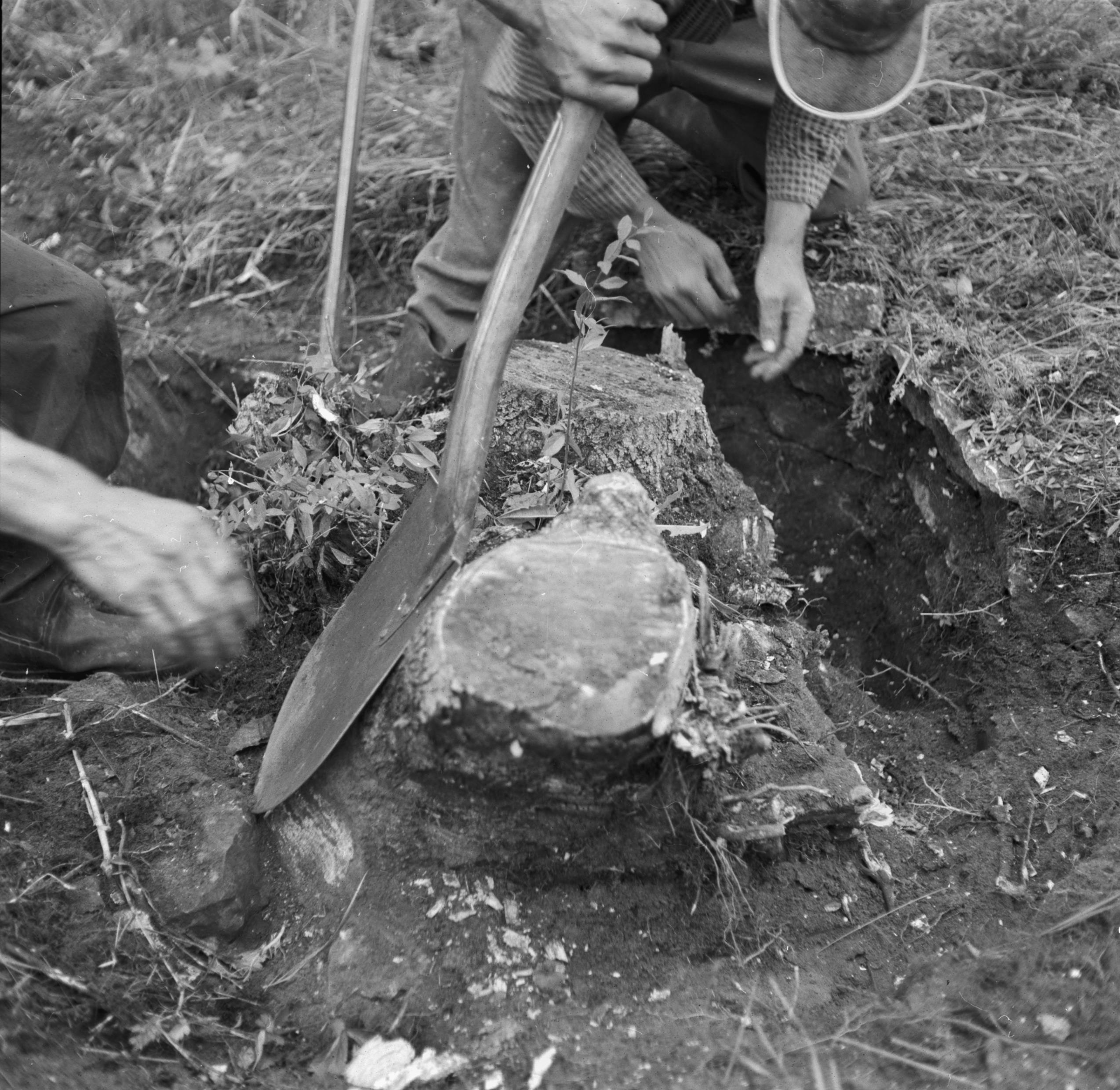 Beskrivning: Brunn i kyrkogårdens nordvästra hörn. Mitt i bilden växte två askar. Till höger syns tydligt stenskoningen. Från öster.