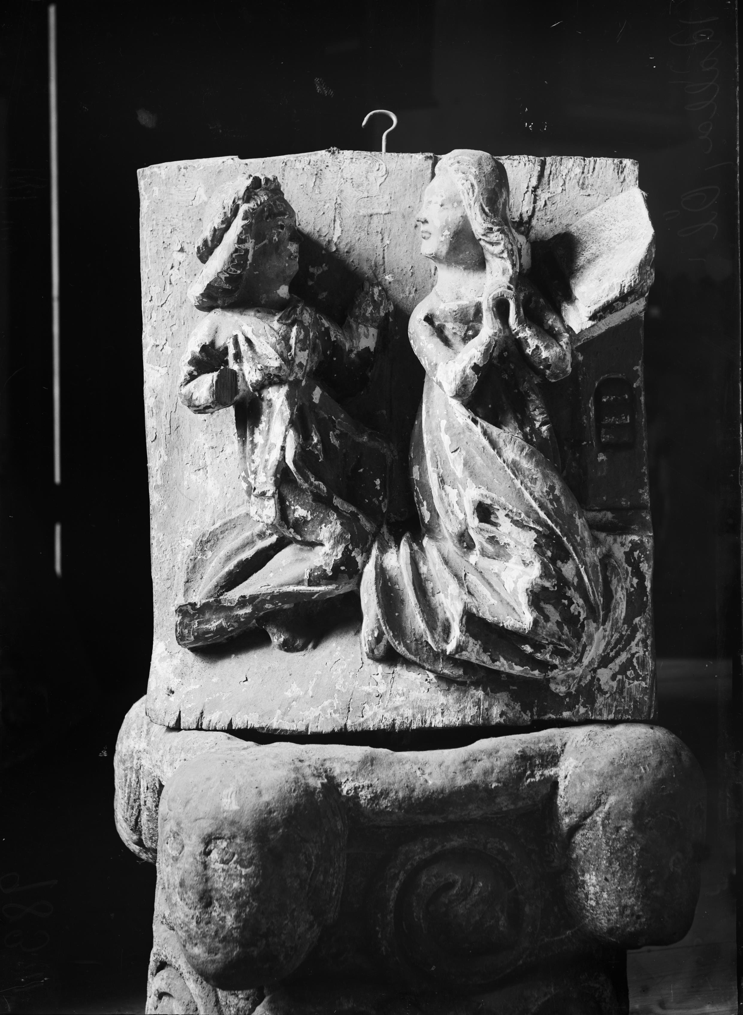 Beskrivning: Träskulptur från altarskåp. Bebådelsen. Kalmar museum.