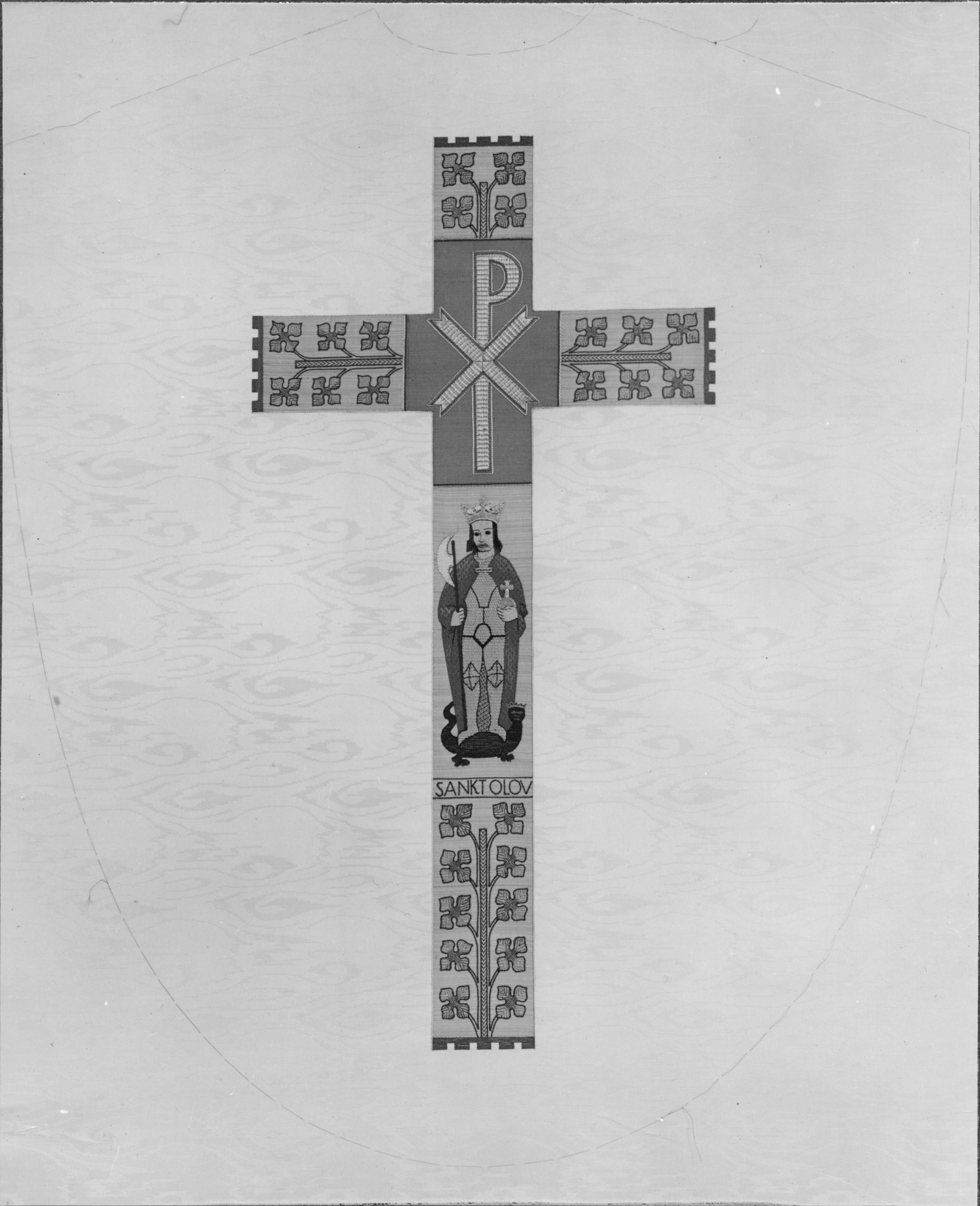 Beskrivning: Kors av textil, komponerat av Sofia Widén.