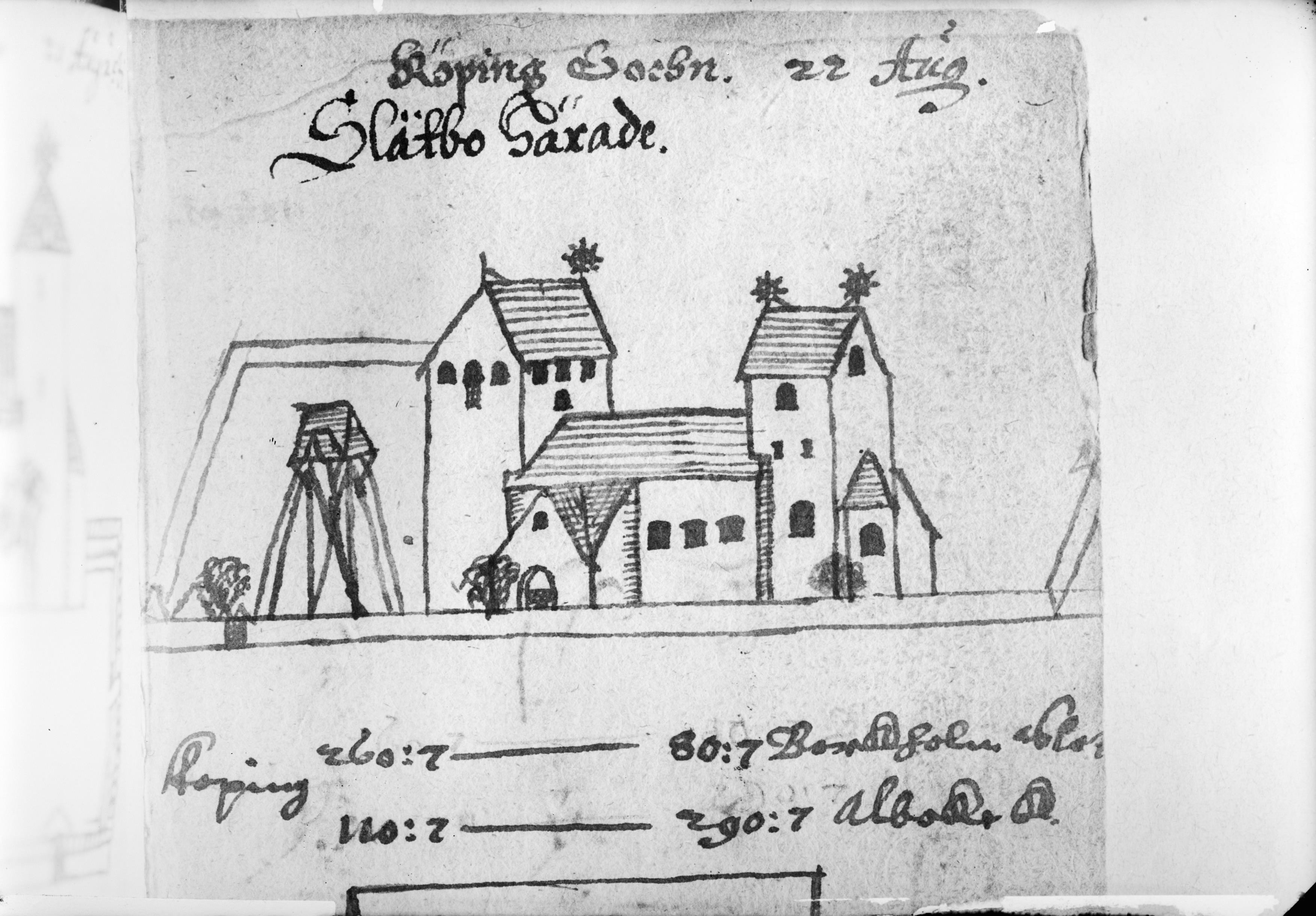 Beskrivning: Teckning av kyrkan från söder. Ur Rhezelius. KB.