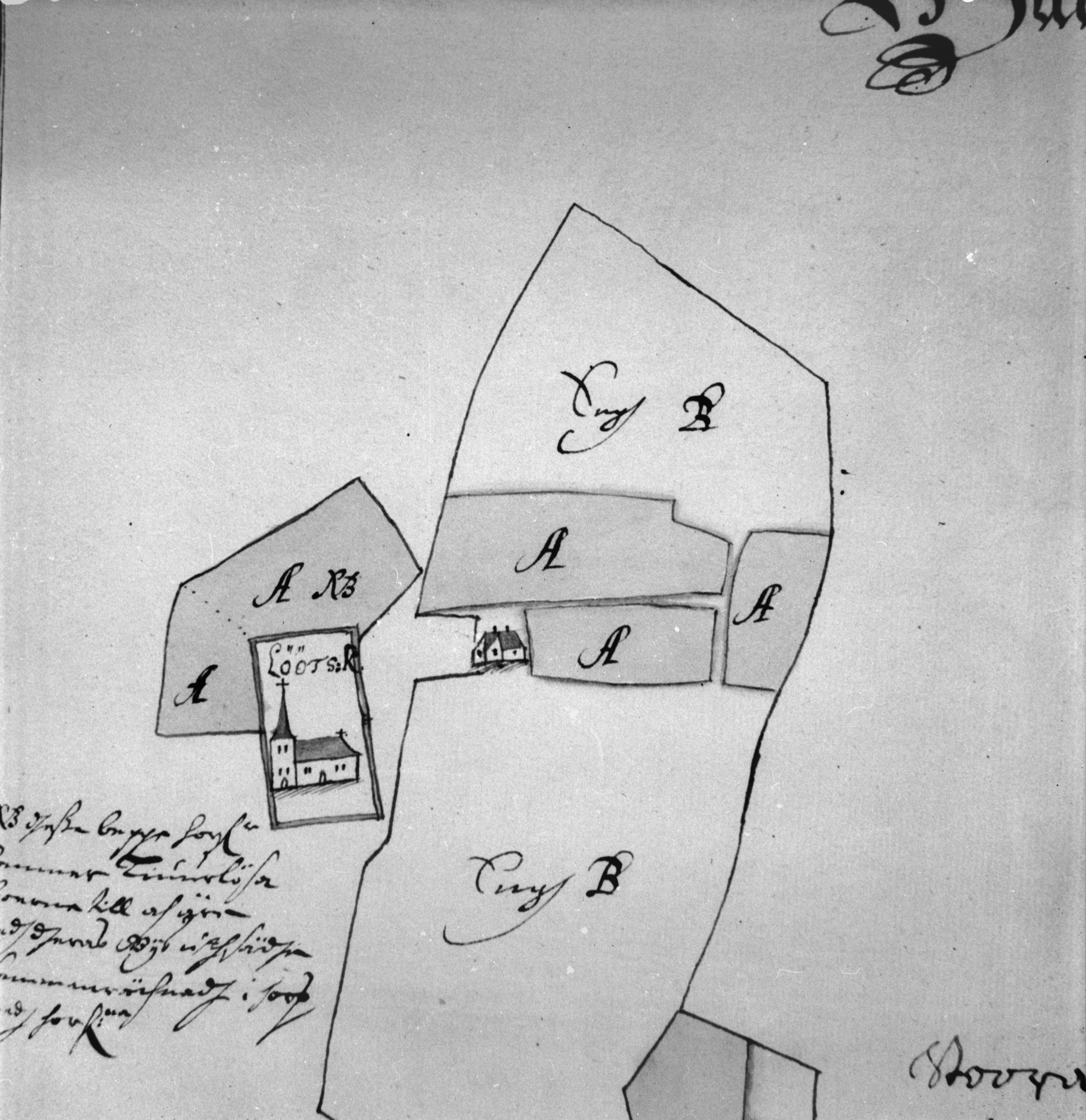 Beskrivning: Teckning av kyrkan från söder, detalj av karta. Ur Geometrisk Book af Ölands Norre Mooth, 1683.