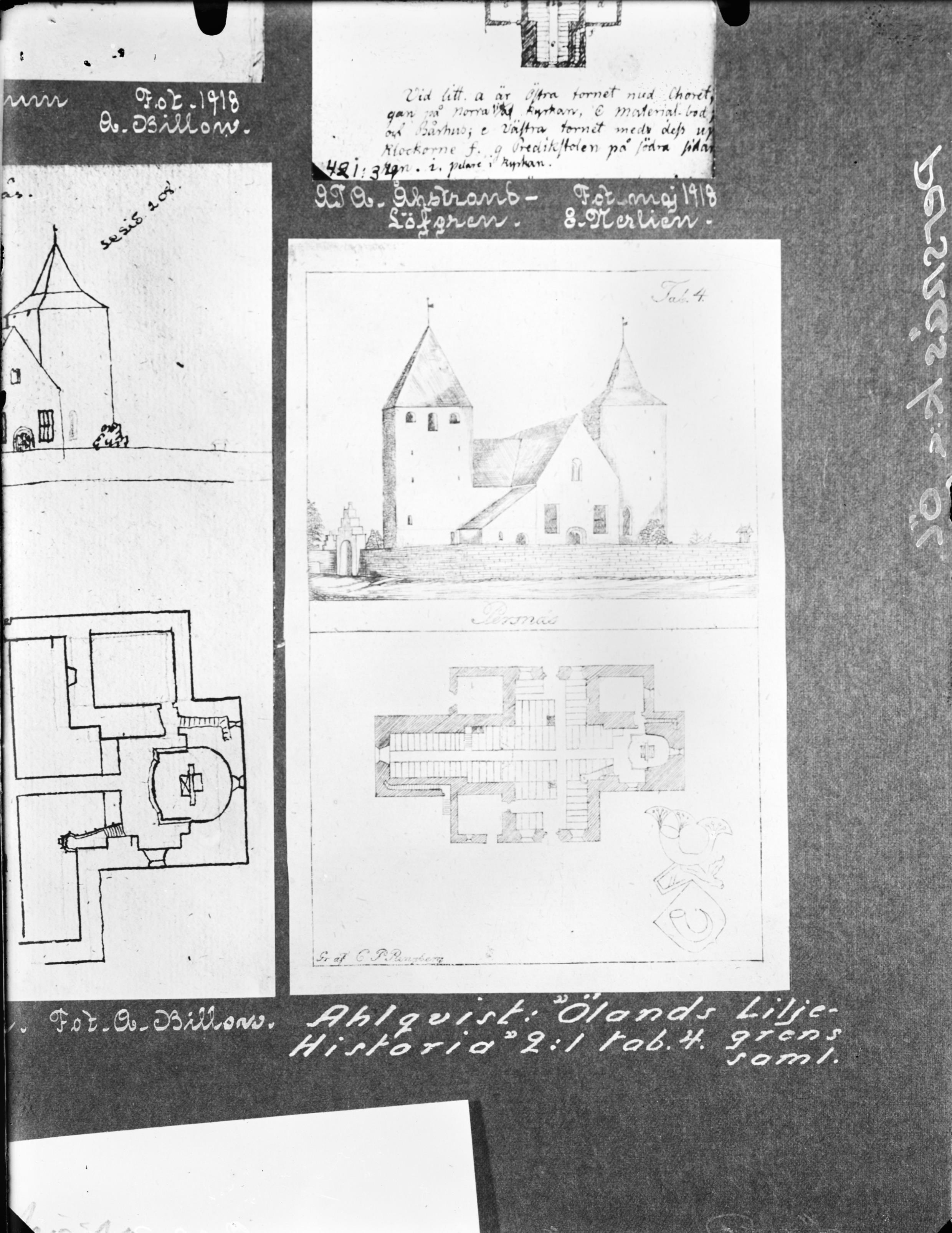 Beskrivning: Teckning av kyrkan, fasad och plan. Ur Ahlqvist Ölands historia.