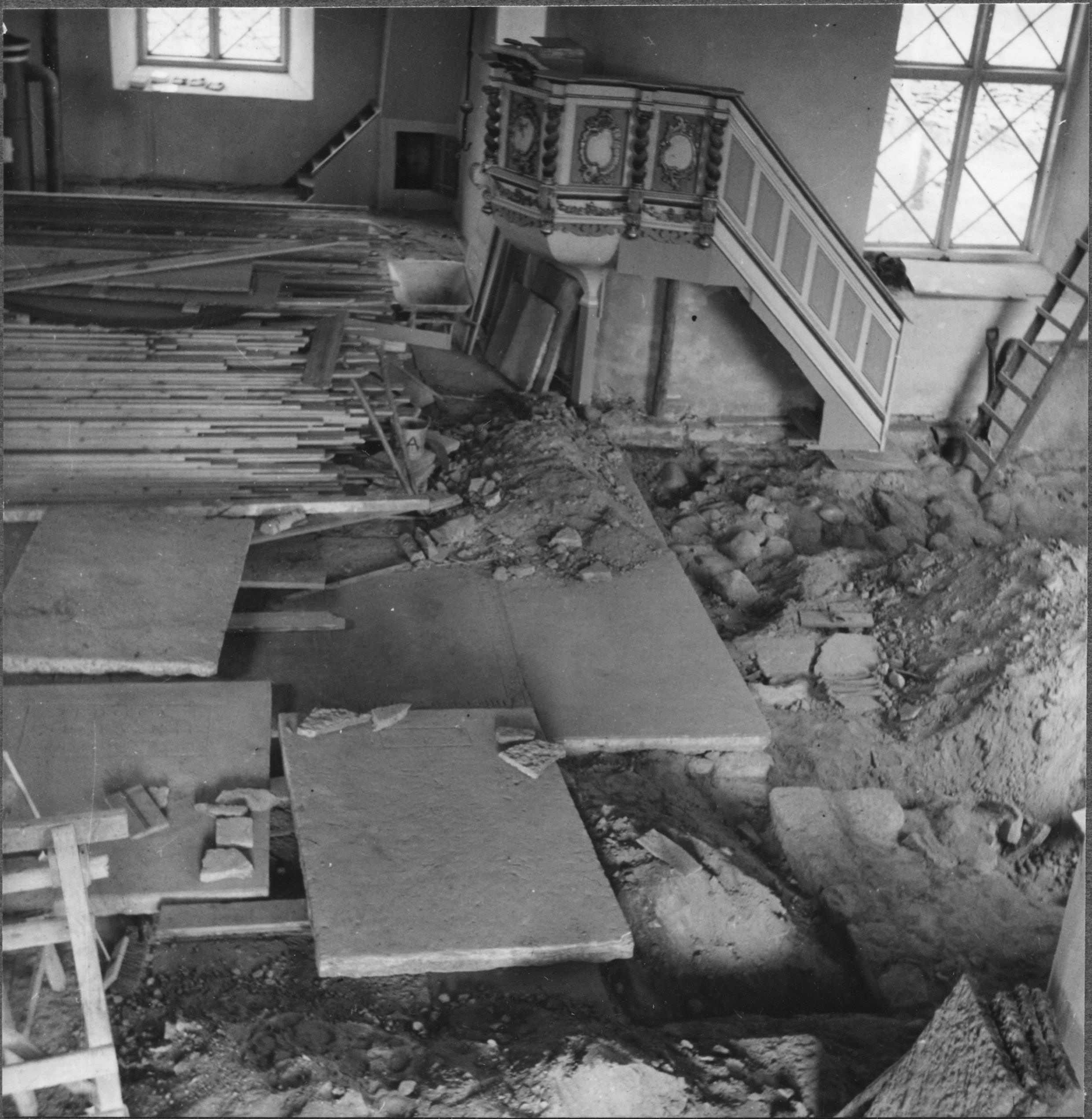 Beskrivning: Restaurering i kyrkan. Nedtill till höger triumfbågens södra vederlag och ett stycke av södra långhusmuren.