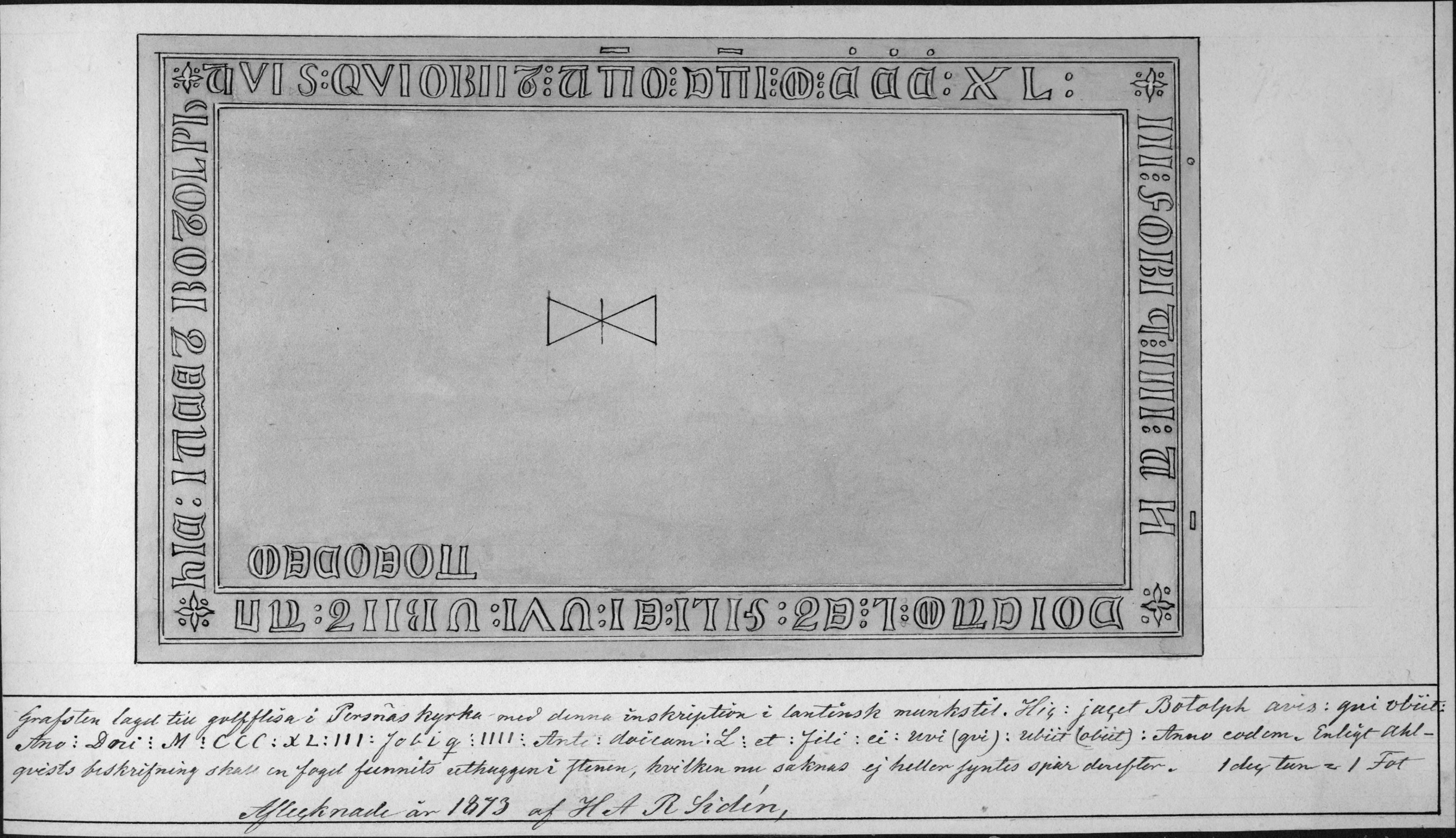Beskrivning: Teckning av gravhäll. Teckning av H. A. R. Sidén 1873.