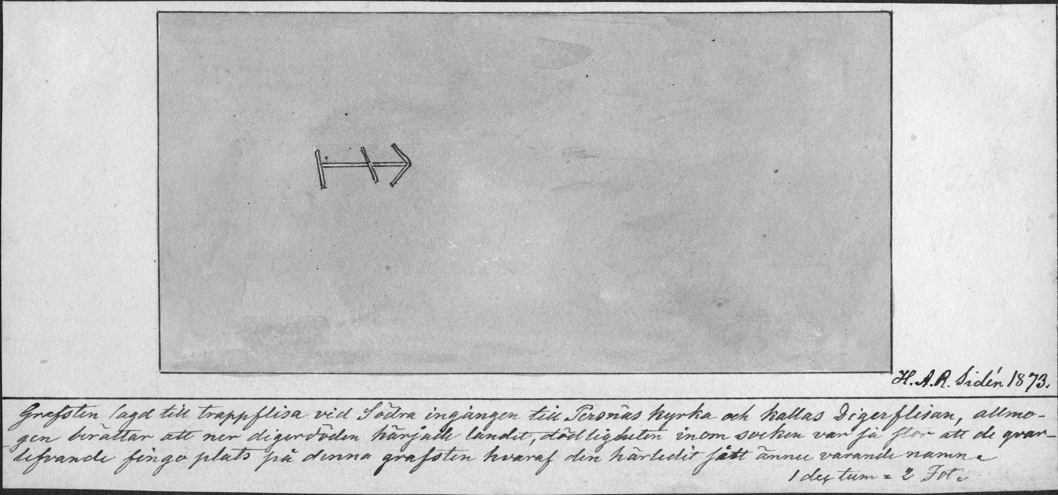 Beskrivning: Teckning av gravhäll. Teckning av H. A. R. Sidén 1873.