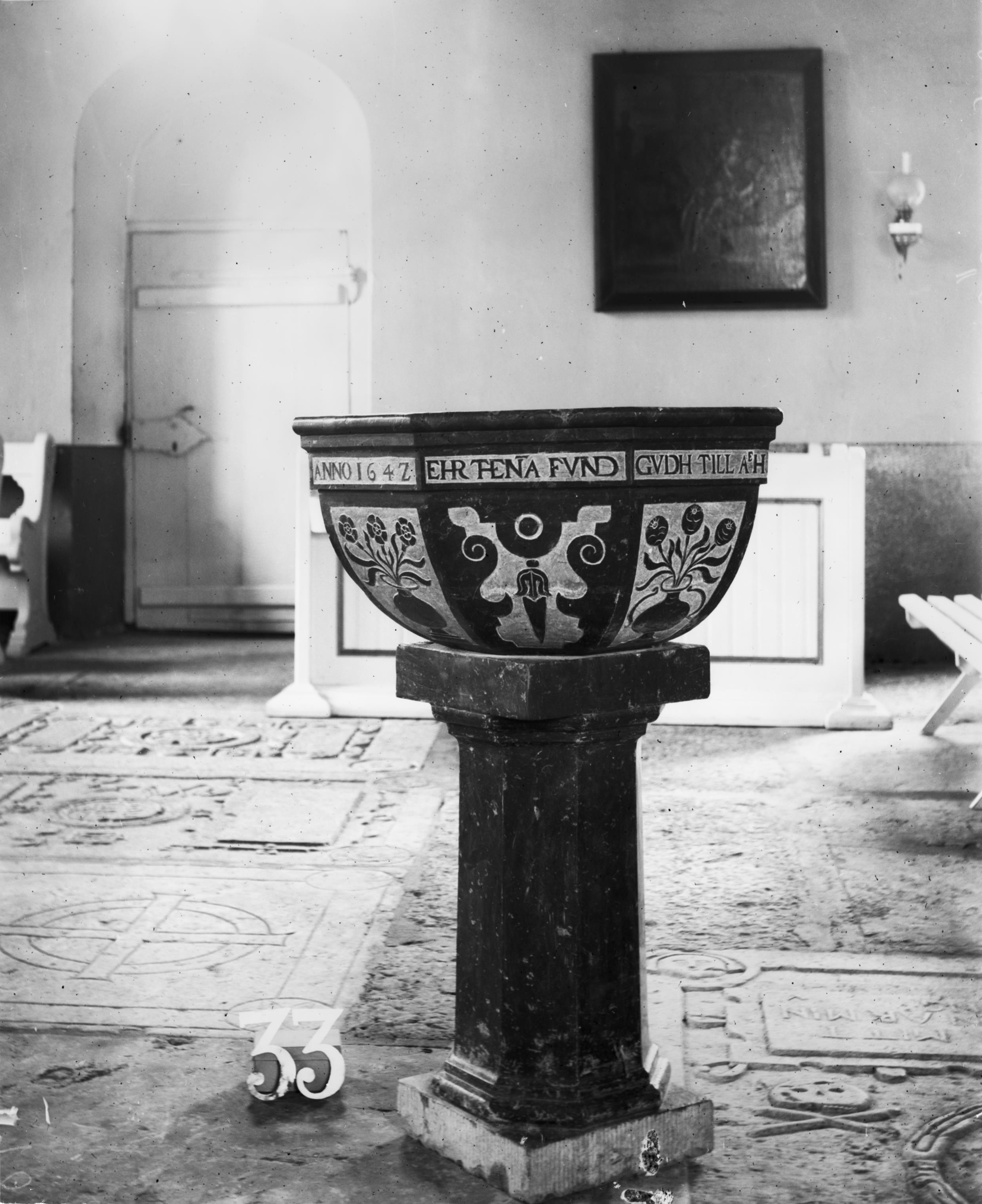 Beskrivning: Dopfunt av röd polerad kalksten.