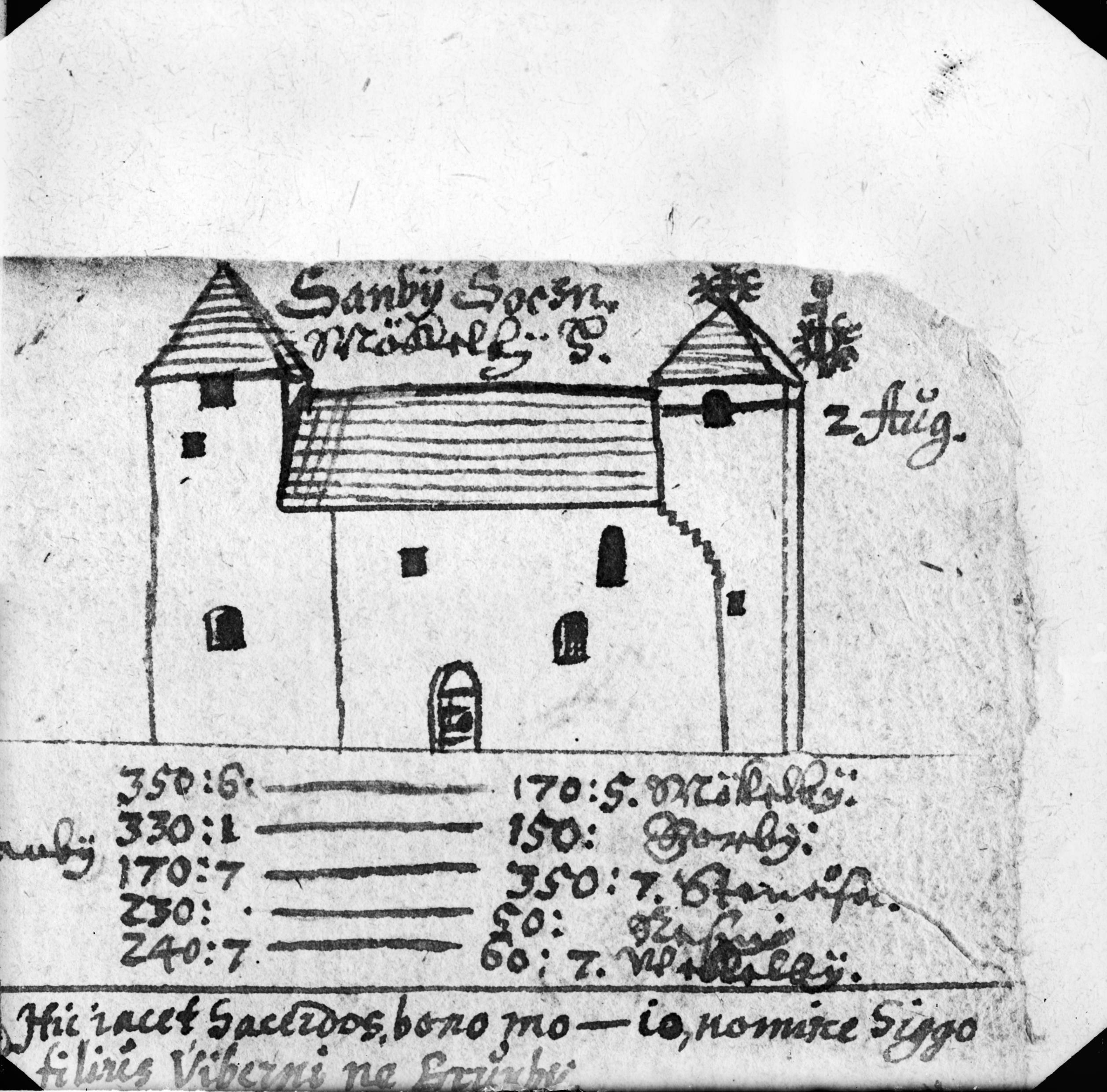 Beskrivning: Teckning av kyrkan från söder. Ur Rhezelius.