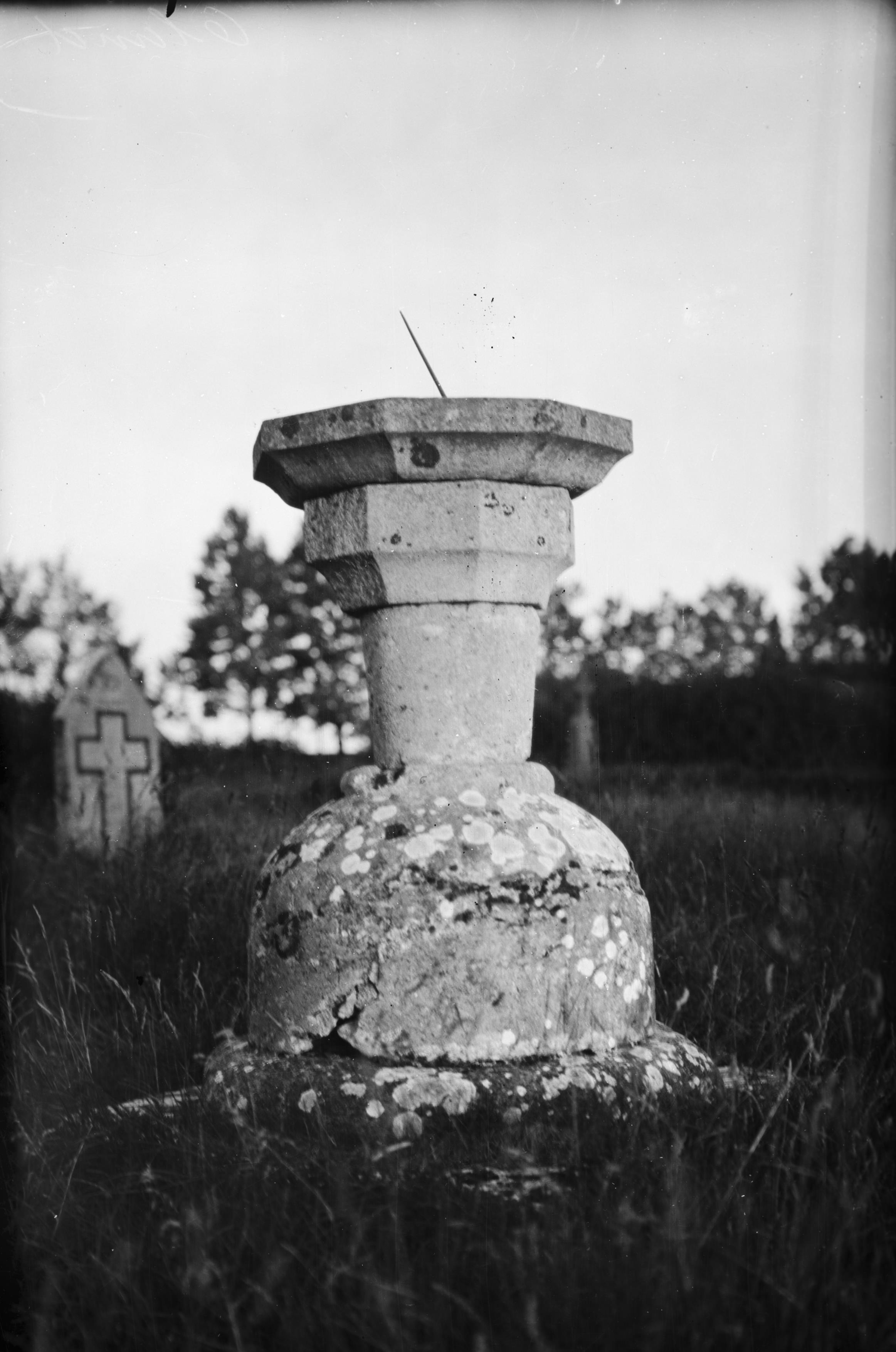Beskrivning: Dopfunt av kalksten uppställd utanför kyrkans sydportal upp och nedvänd som solvisare.