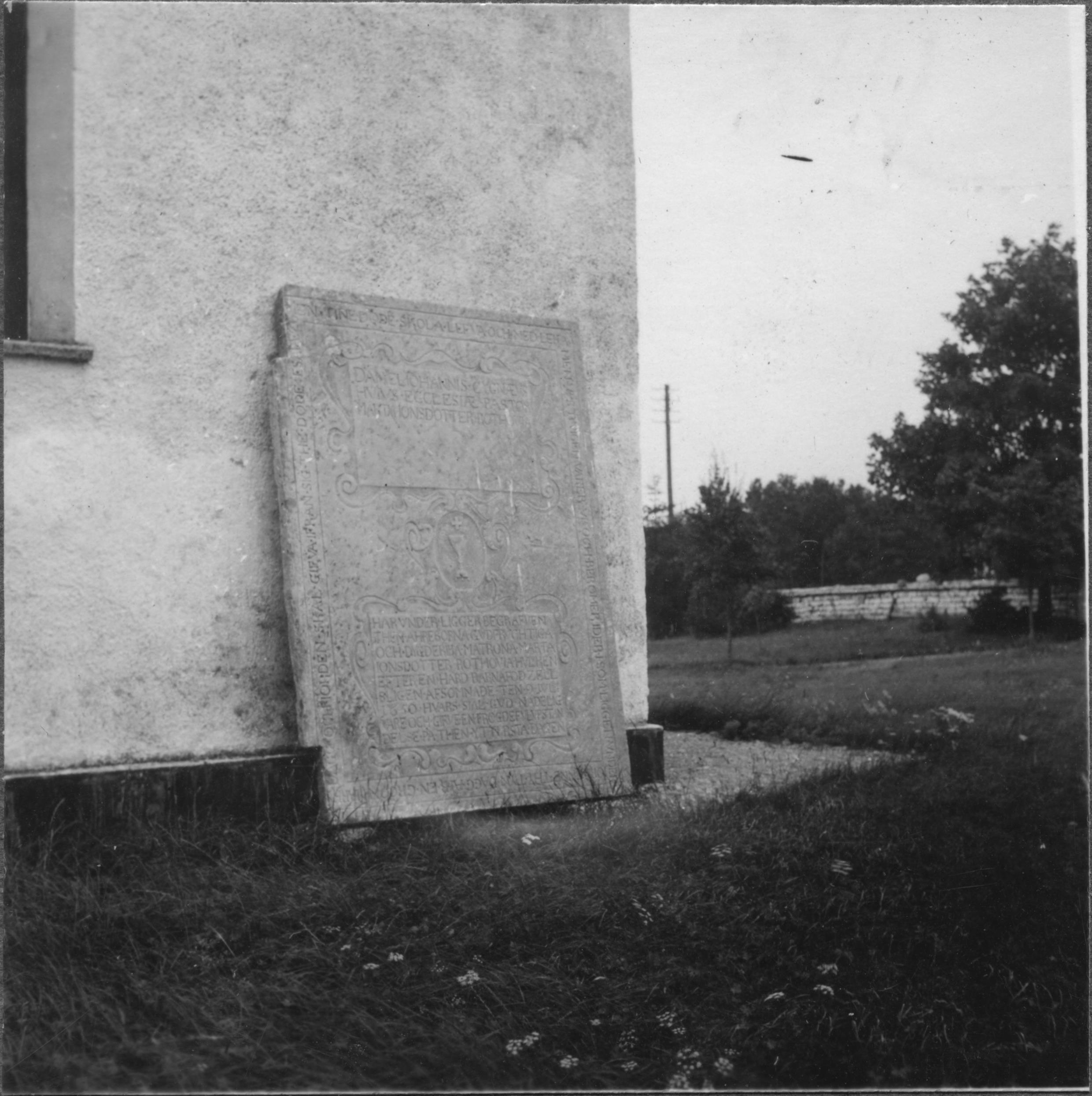 Beskrivning: Gravhäll vid norra tornmuren.