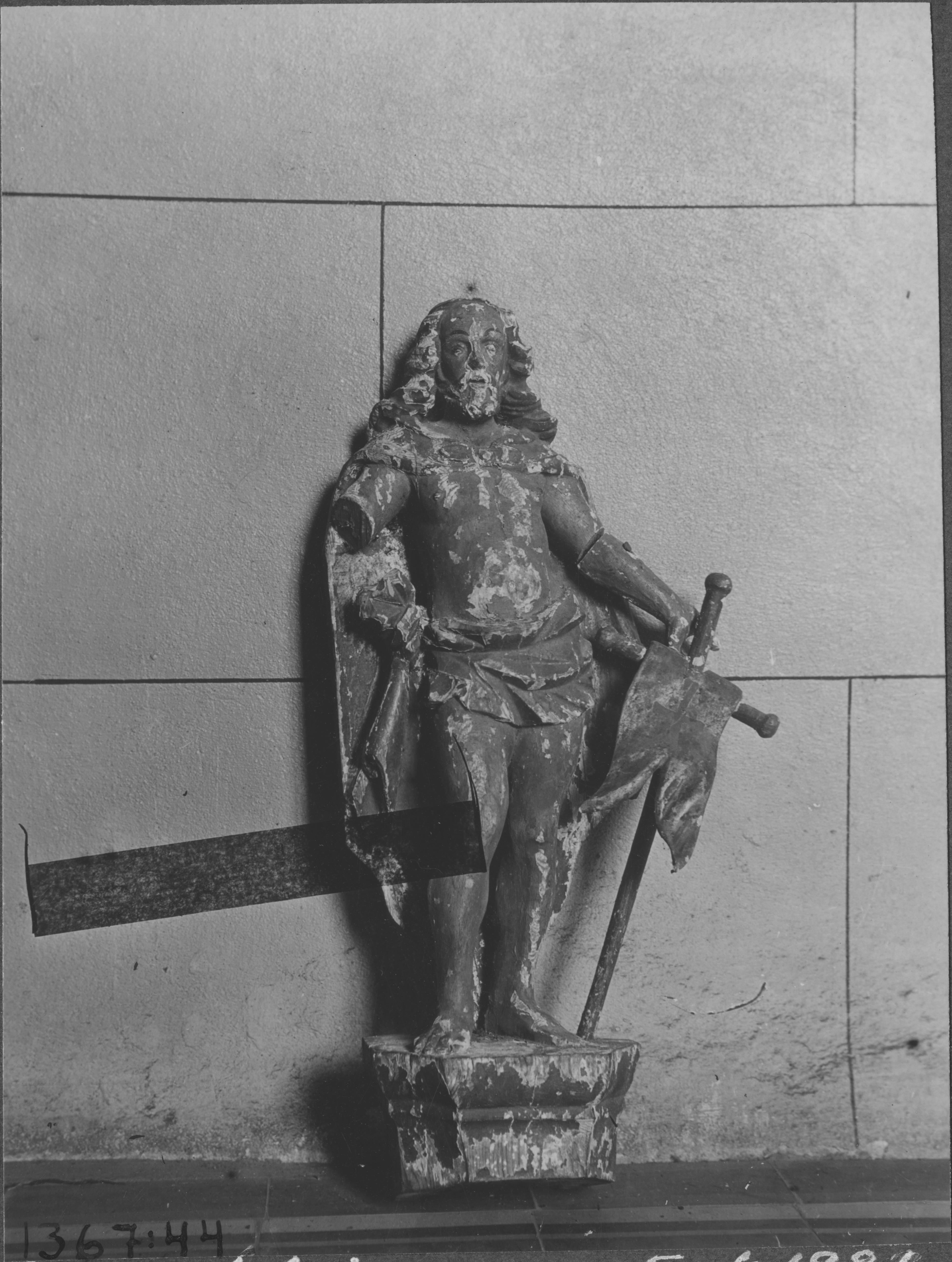 Beskrivning: Träskulptur föreställande Kristus med gördel och mantel.