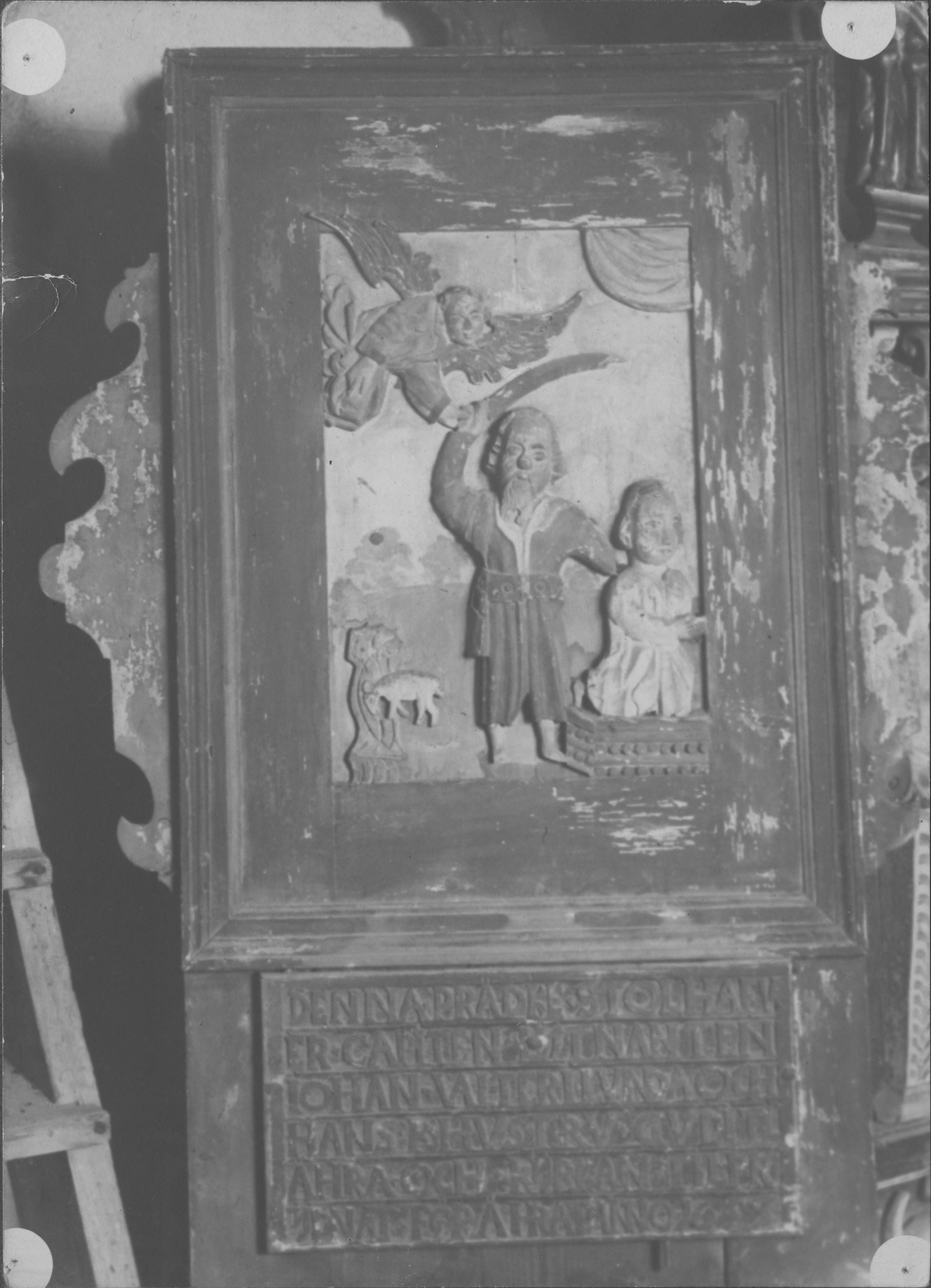 Beskrivning: Del av predikstol med relief och inskription: "Denna prädkestol hafver capitenlietnanten Johan Walter i Lunda och hans k. hustru Gudi til ähra och kyrkan til prydnat förährat anno 1653.