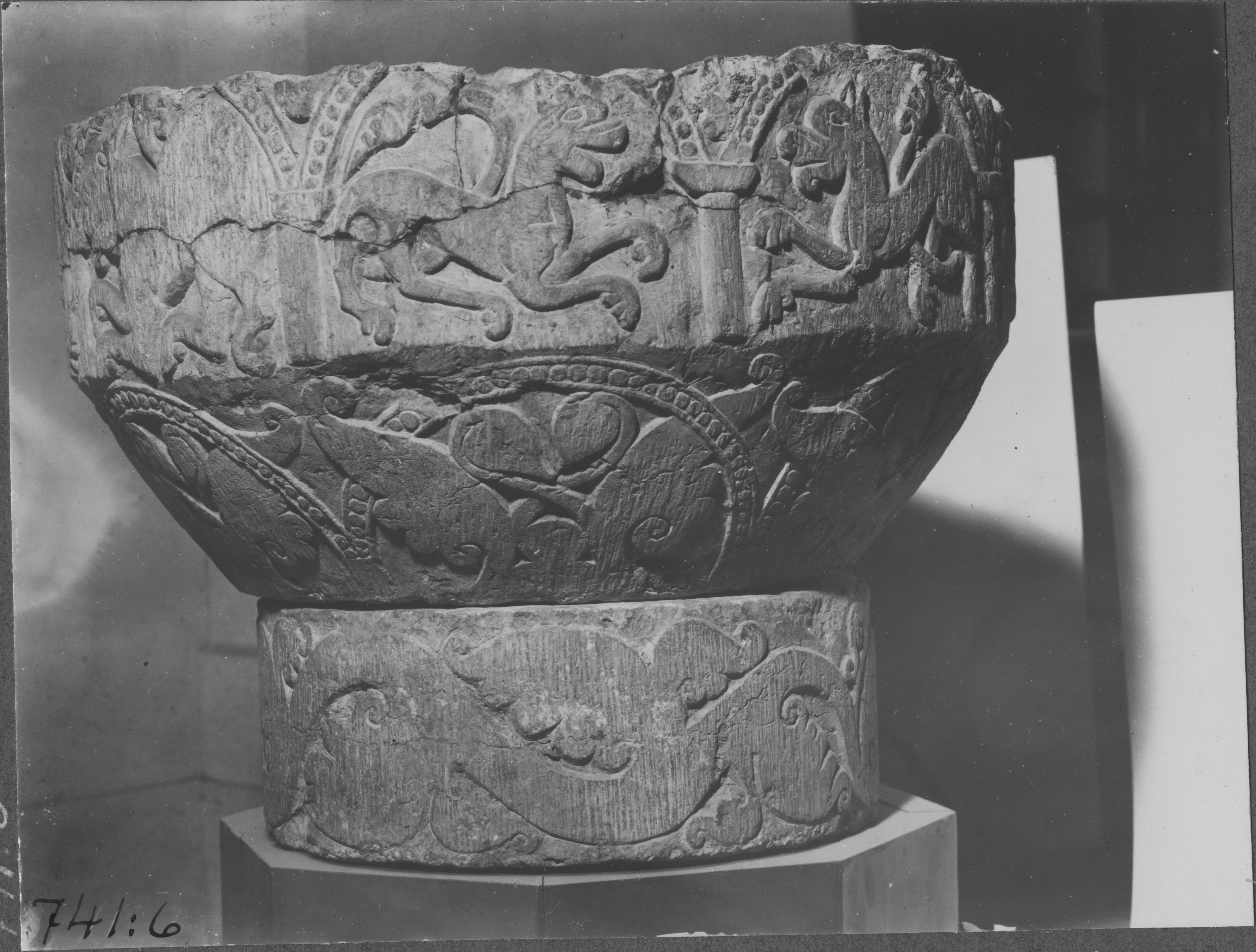 Beskrivning: Dopfunt av grå kalksten med rödputsade ornament, blomster och djur. SHM inv nr 7890.