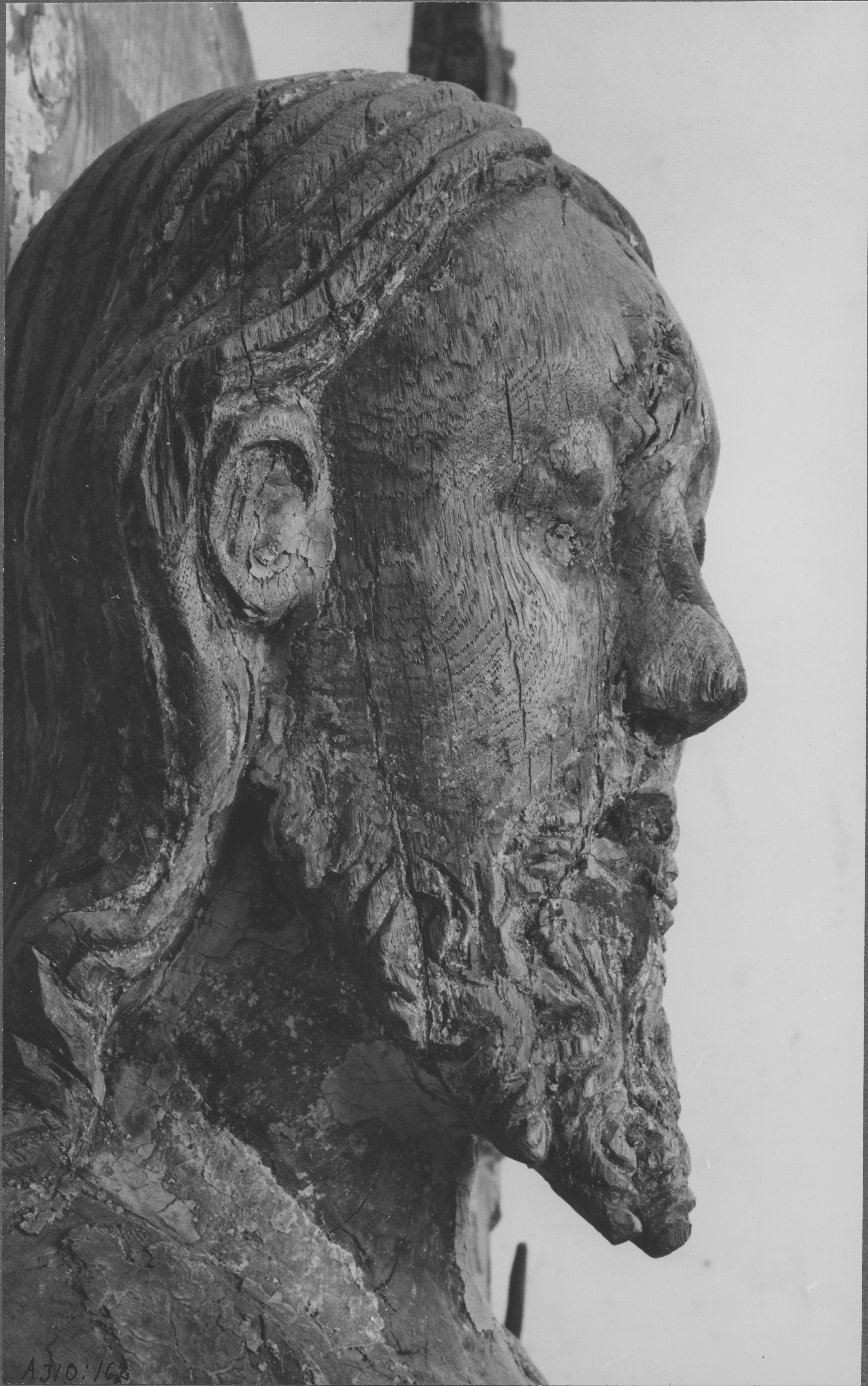 Beskrivning: Träskulptur föreställande Johannes Döparen, detalj.