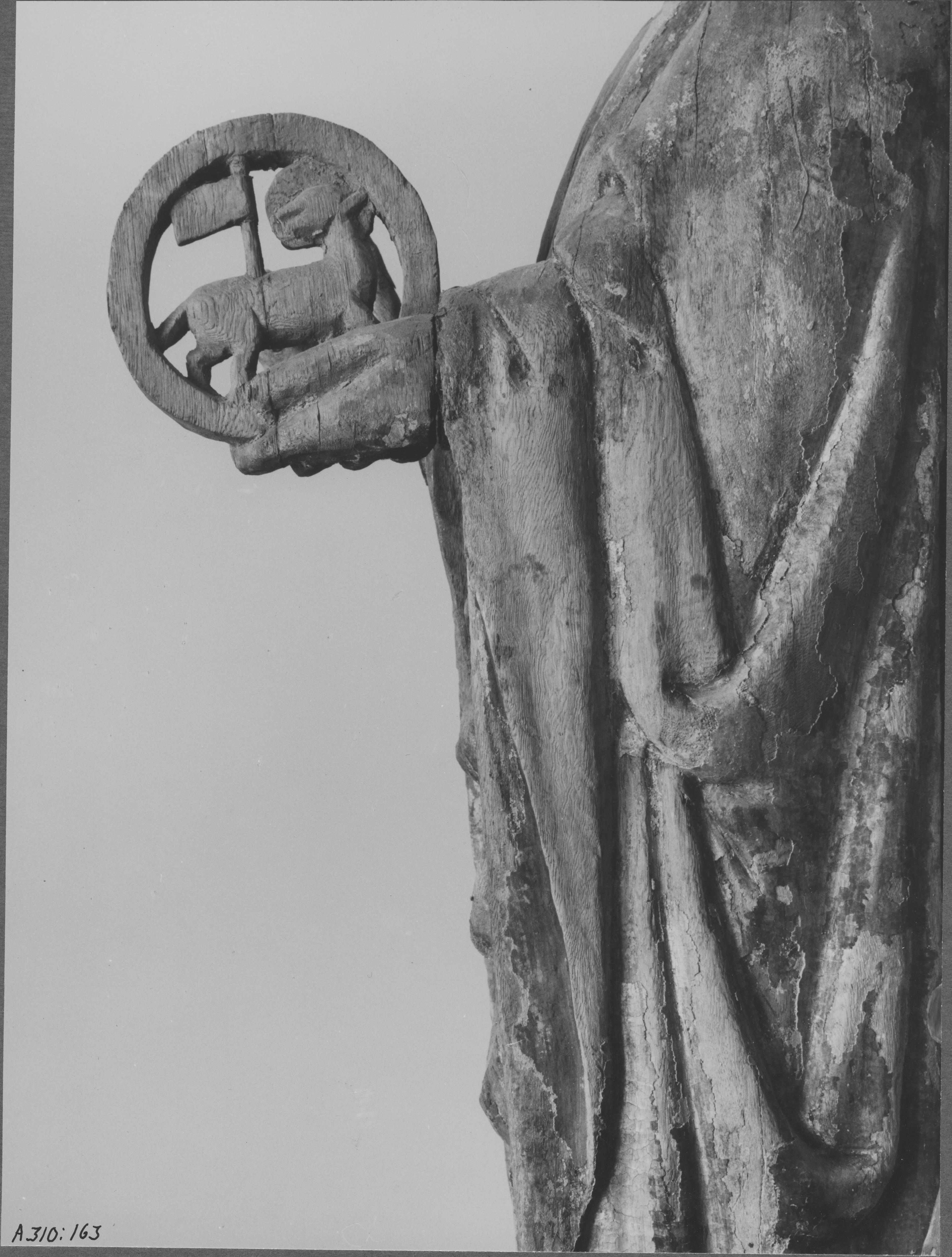 Beskrivning: Träskulptur föreställande Johannes Döparen, detalj.