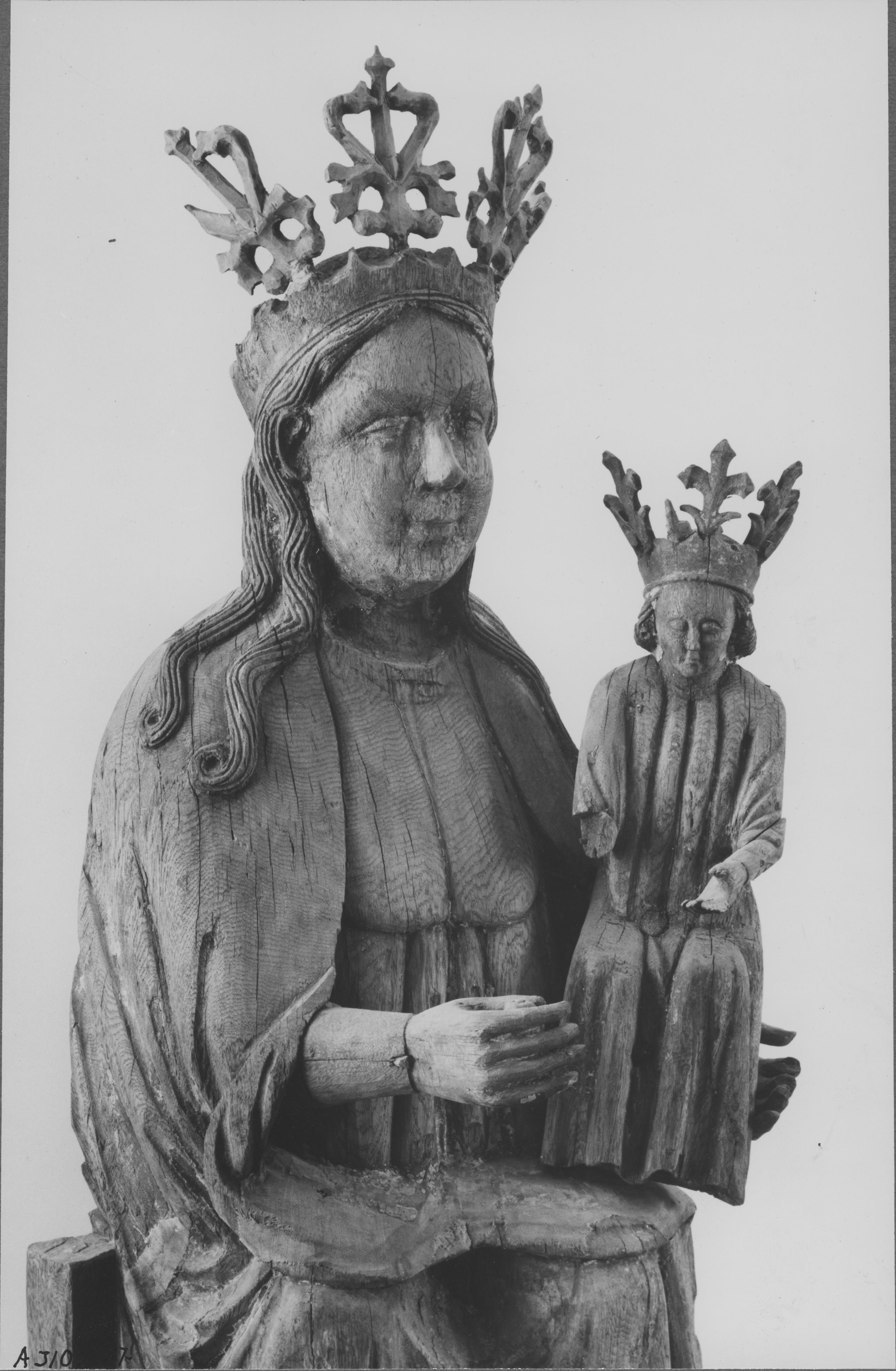Beskrivning: Beskrivning: Träskulptur föreställande Madonnan och barnet, detalj.