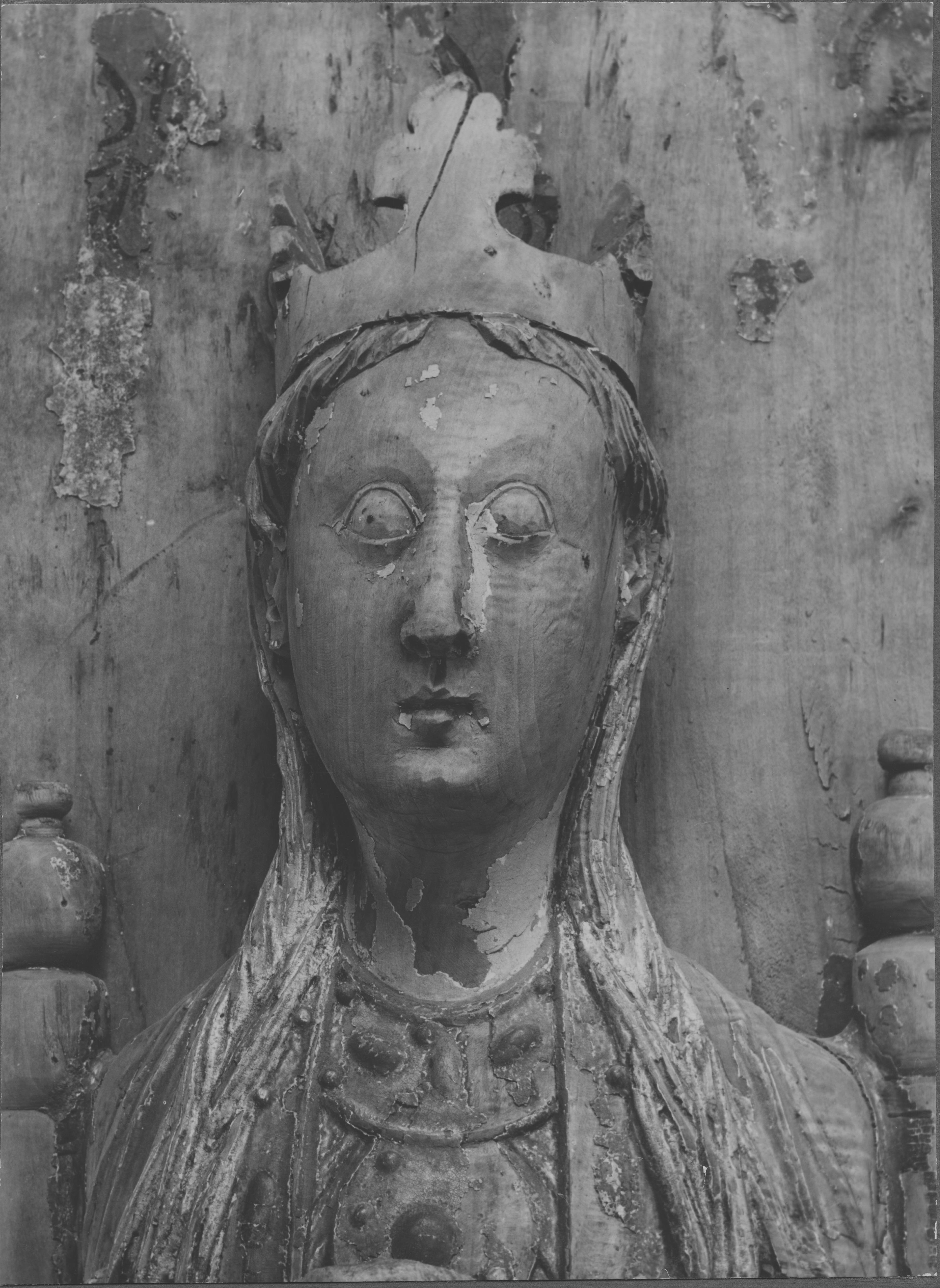 Beskrivning: Träskulptur föreställande Madonnan och barnet, detalj.
