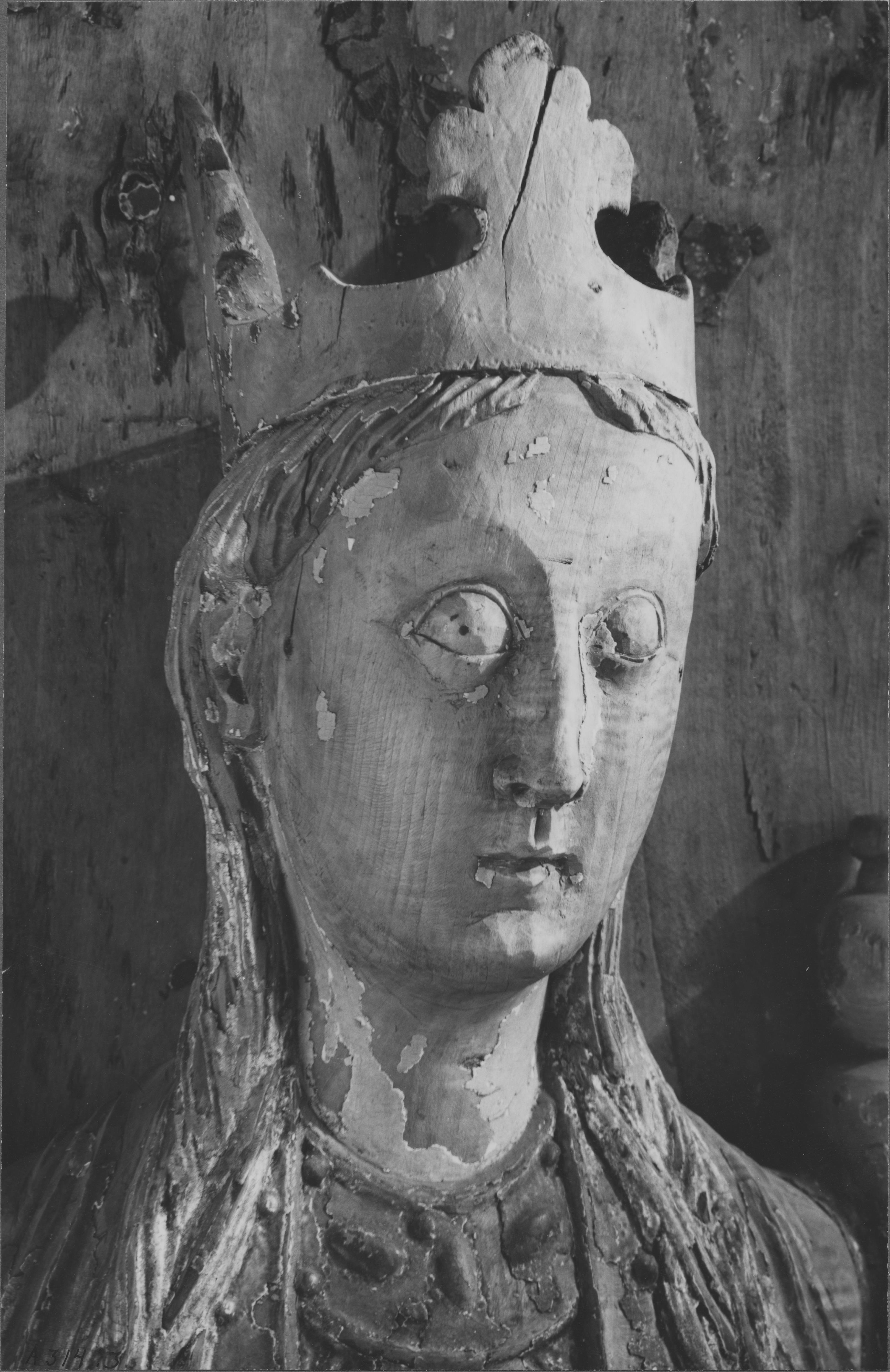Beskrivning: Träskulptur föreställande Madonnan och barnet, detalj.