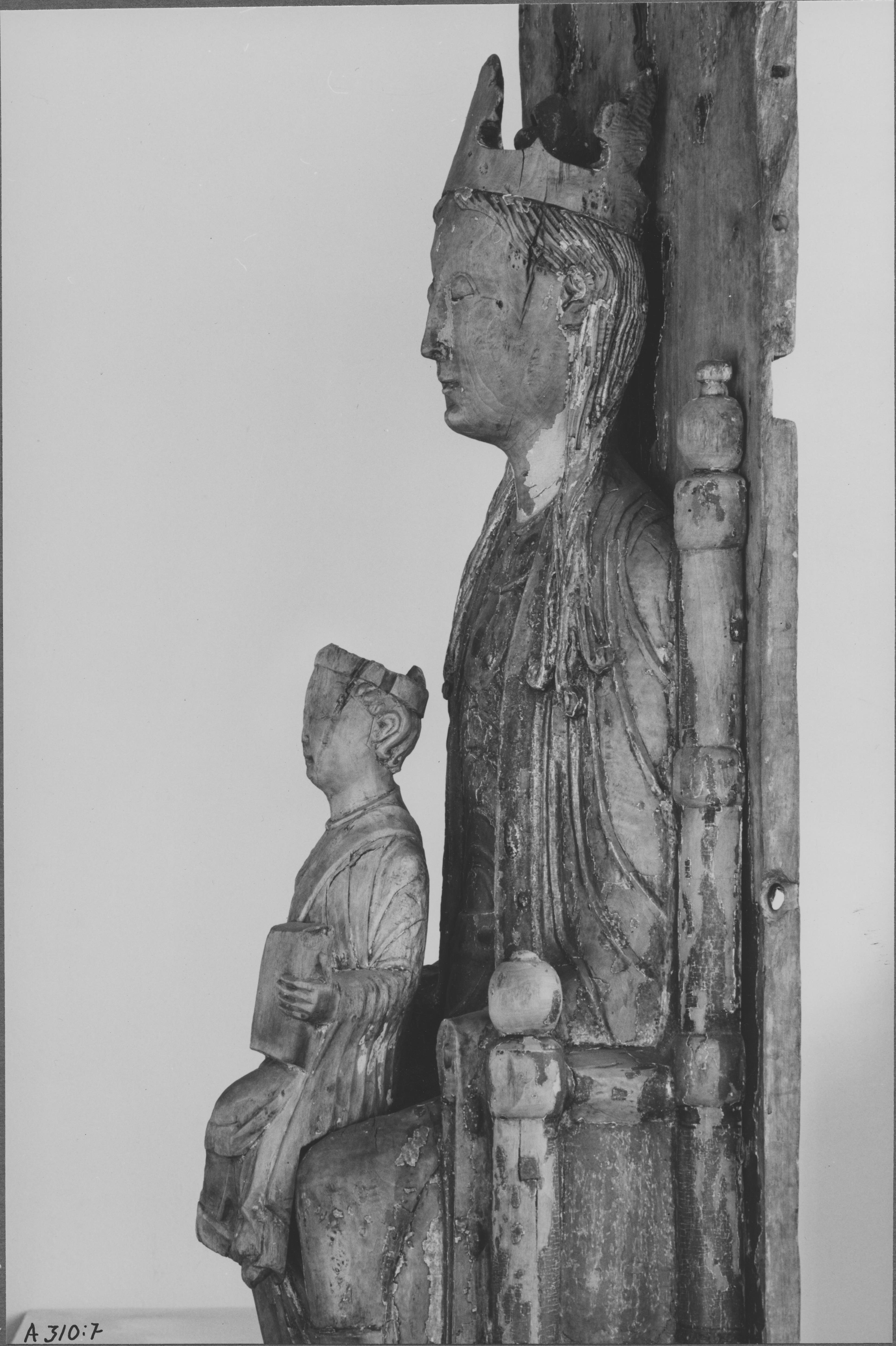 Beskrivning: Träskulptur föreställande Madonnan och barnet, detalj.