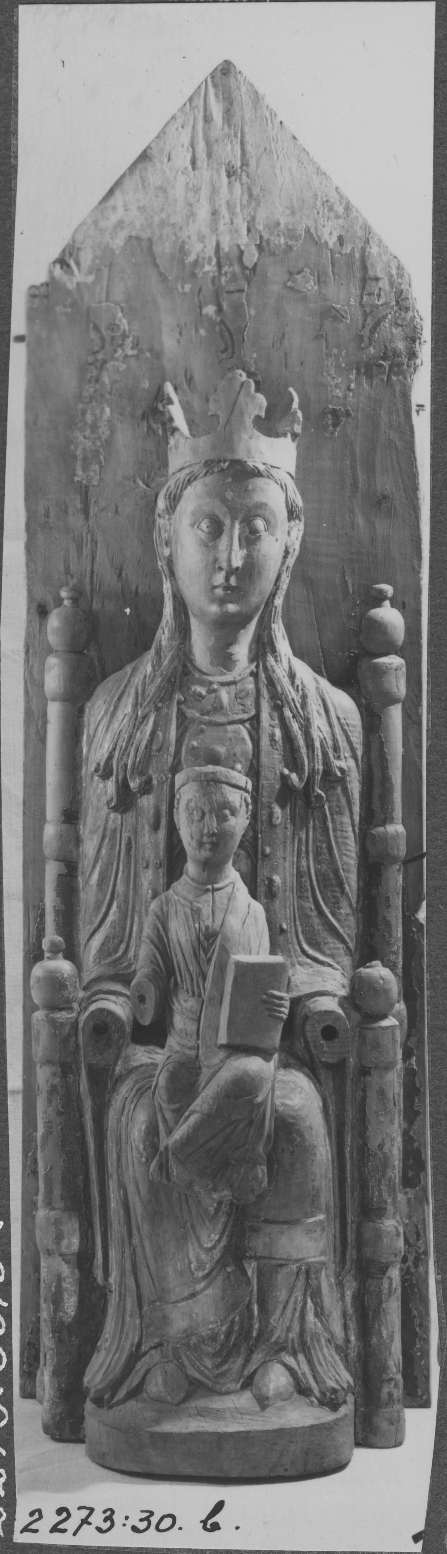 Beskrivning: Träskulptur föreställande Madonnan och barnet.