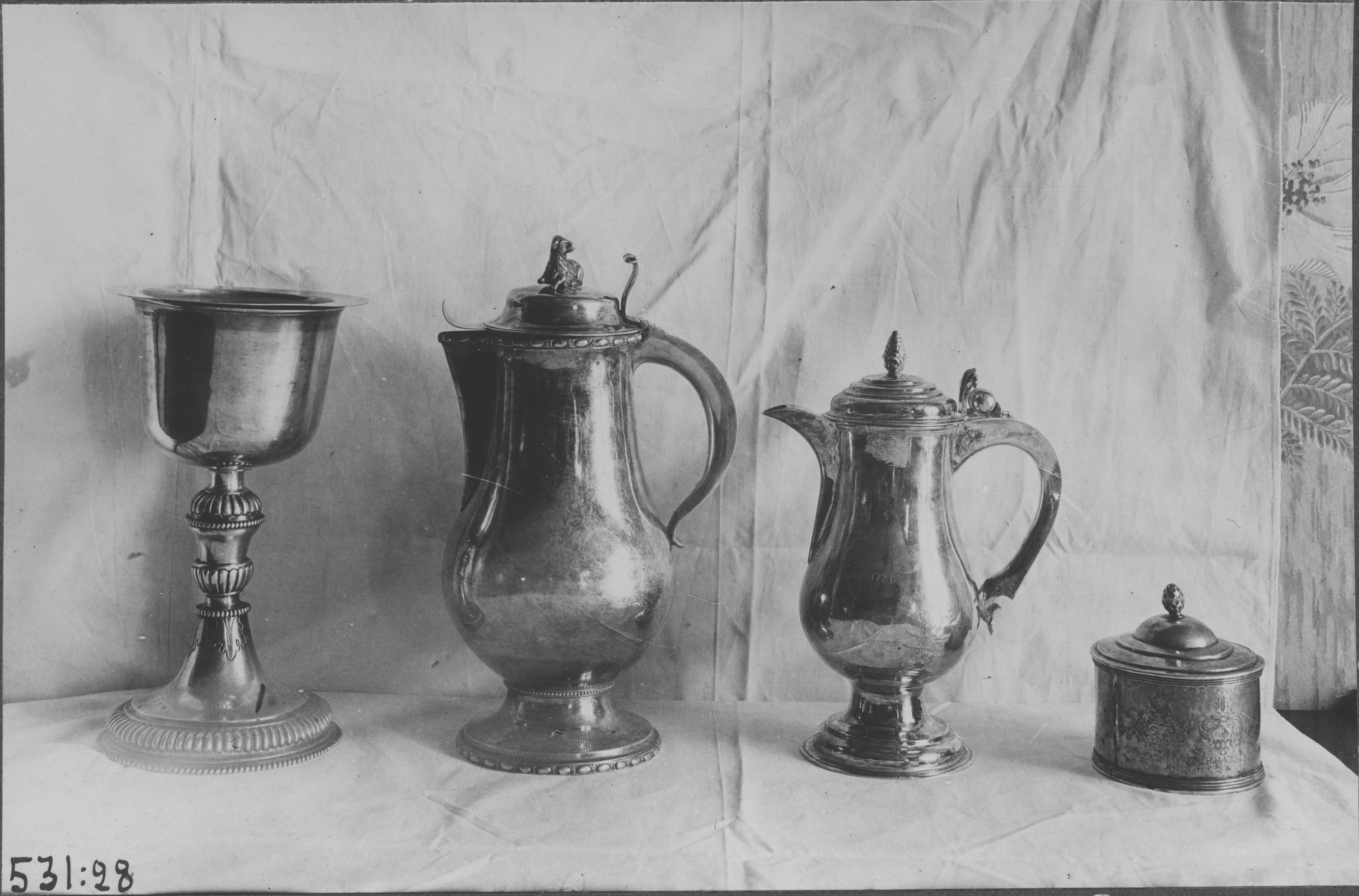 Beskrivning: Kalk med patén, vinkannor och oblatask.