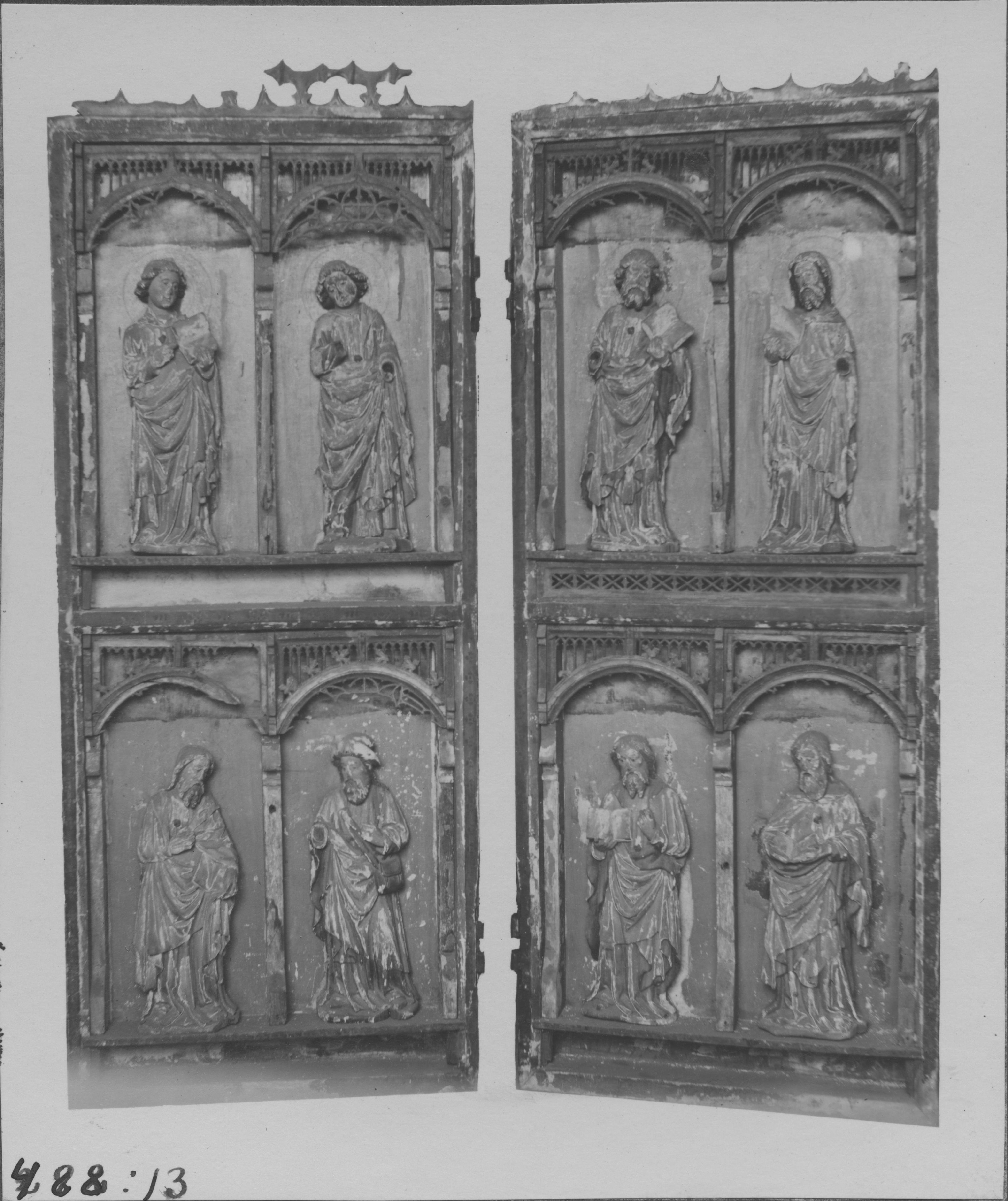 Beskrivning: Altarskåp med snidade och målade träfigurer. Före restaurering 1918.