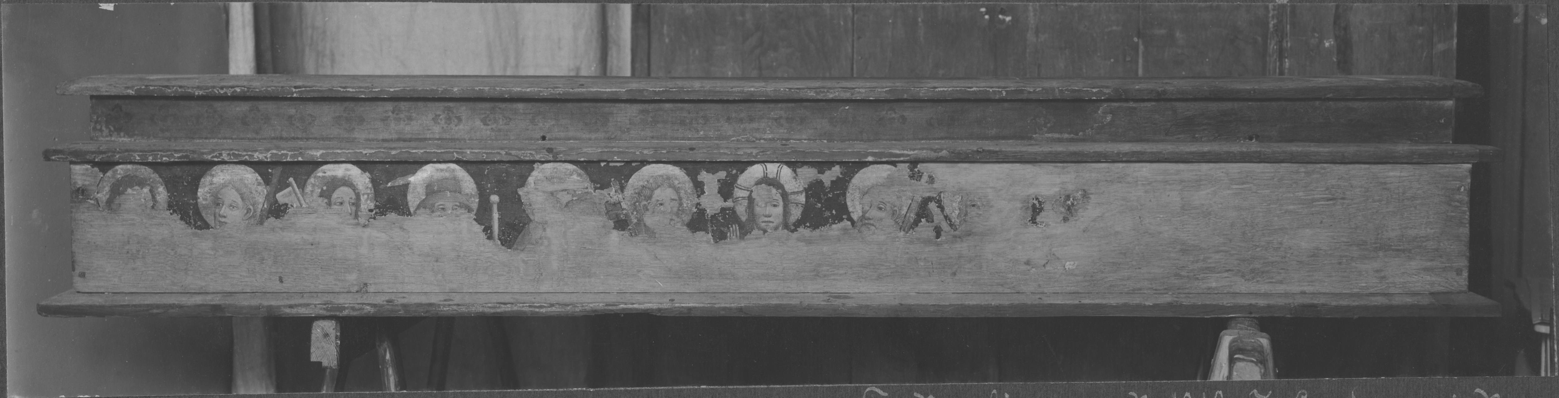 Beskrivning: Fotstycke till altarskåp med målade bröstbilder av Kristus och apostlarna. Efter restaurering 1919.
