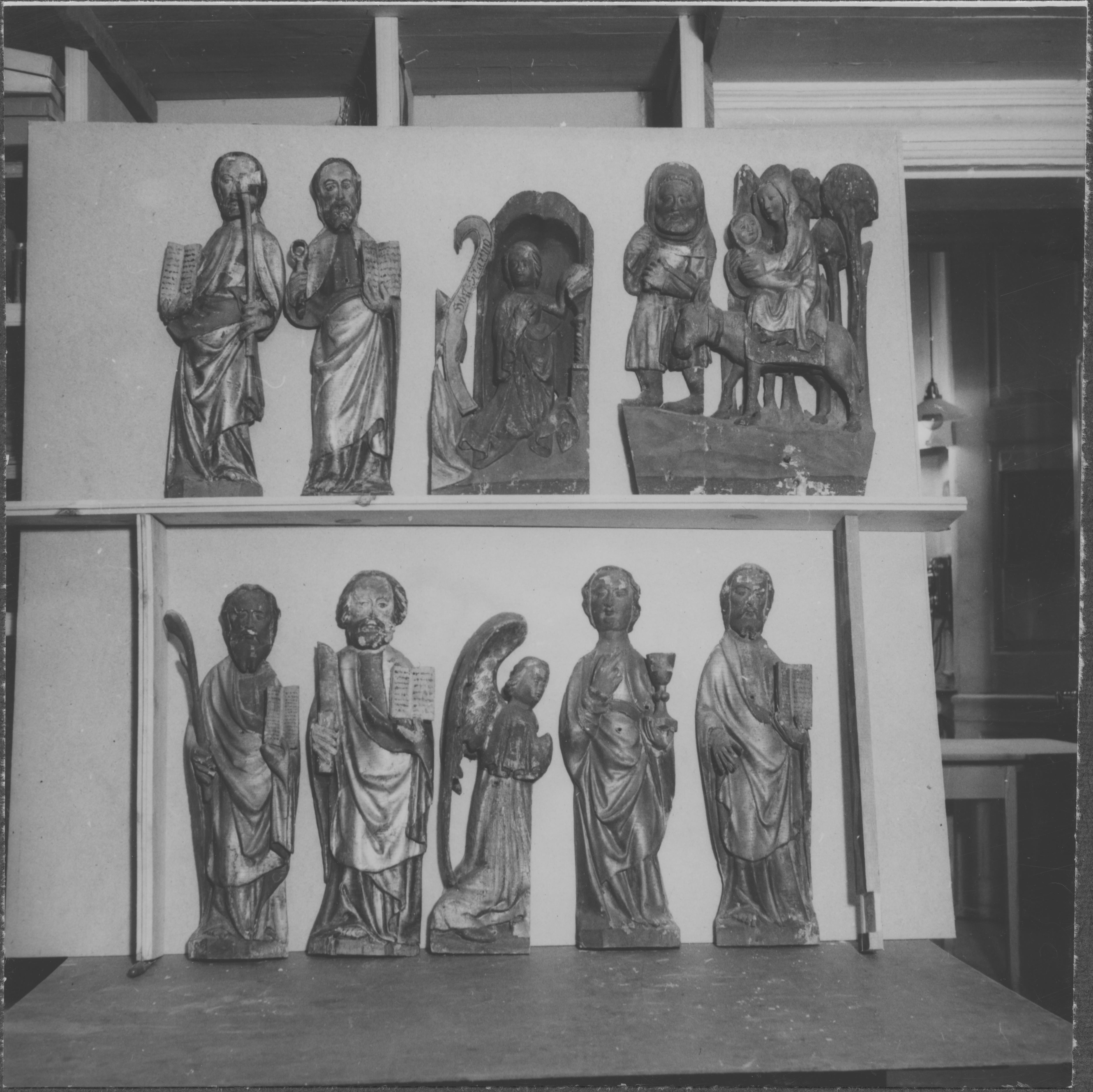 Beskrivning: Figurer från altarskåp, Före restaureringen.
