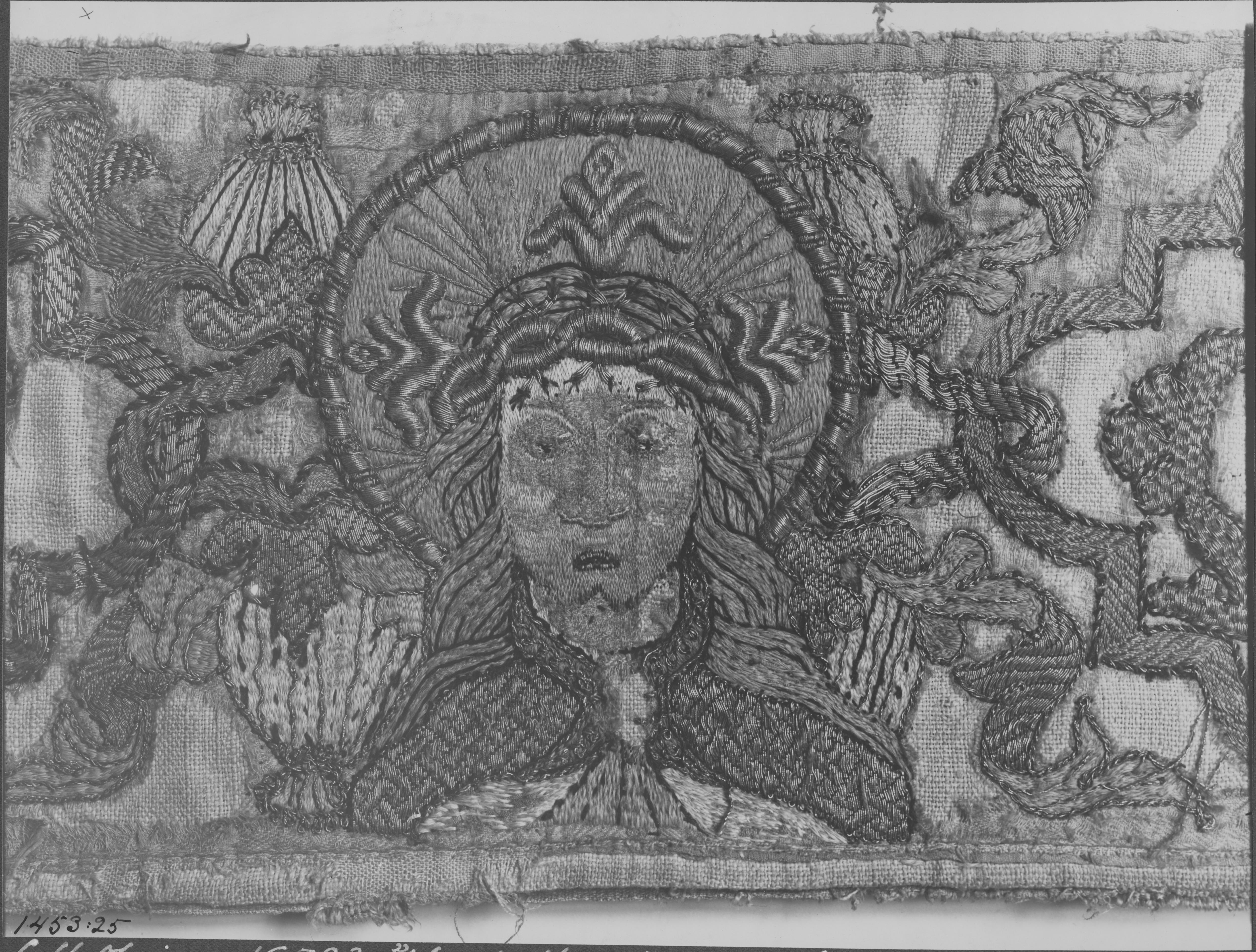 Beskrivning: Detalj av altarbrun med broderi i guld och silver.