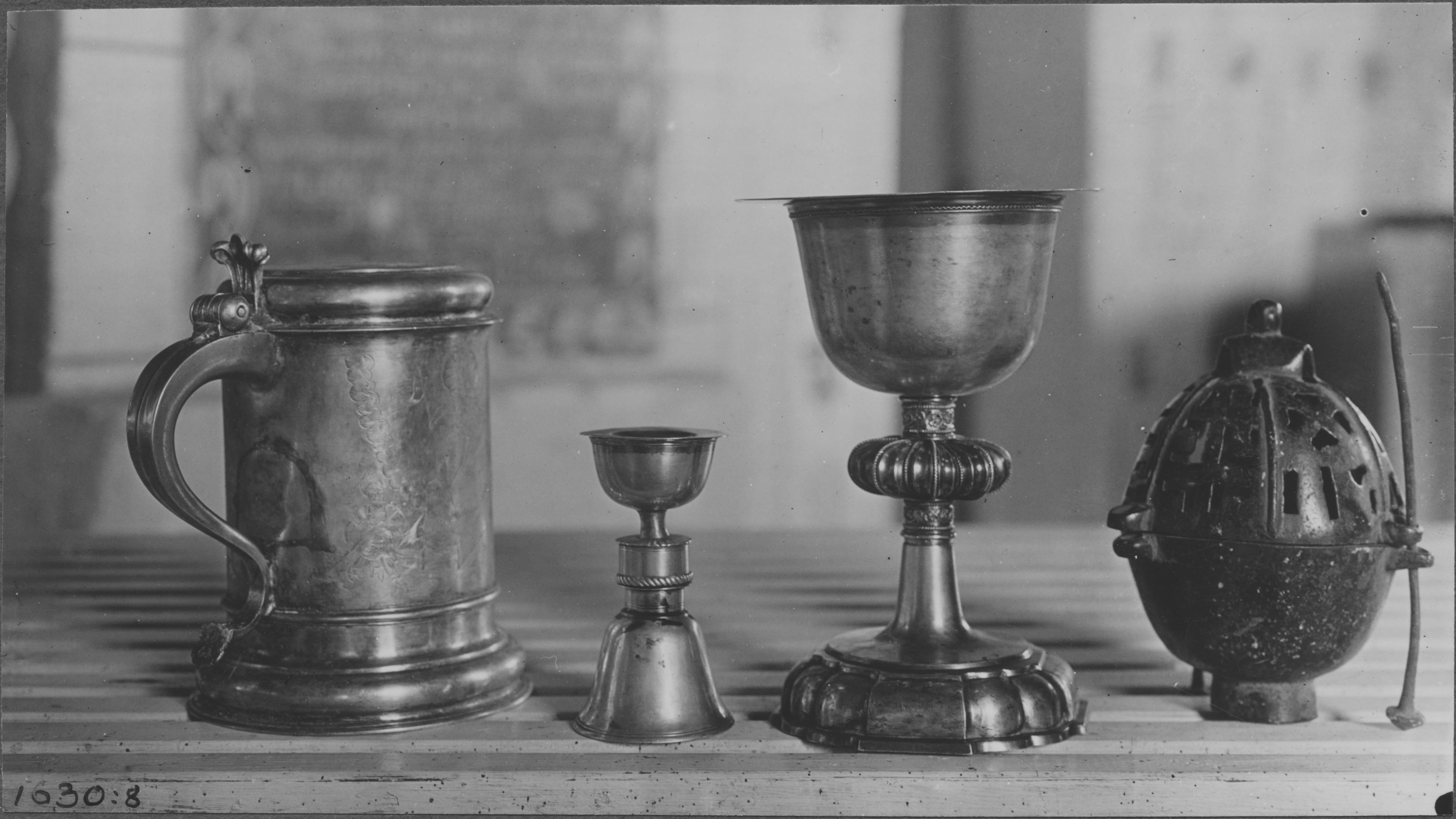 Beskrivning: Vinkanna av silver från 1658. Sockenbudstyg. Kalken inuti förgylld. Klockformig fot. 1700-talets förra hälft. Kalk av silver, inuti, runt foten och noden förgylld. Rökelsekar av malm. 1200-talet.