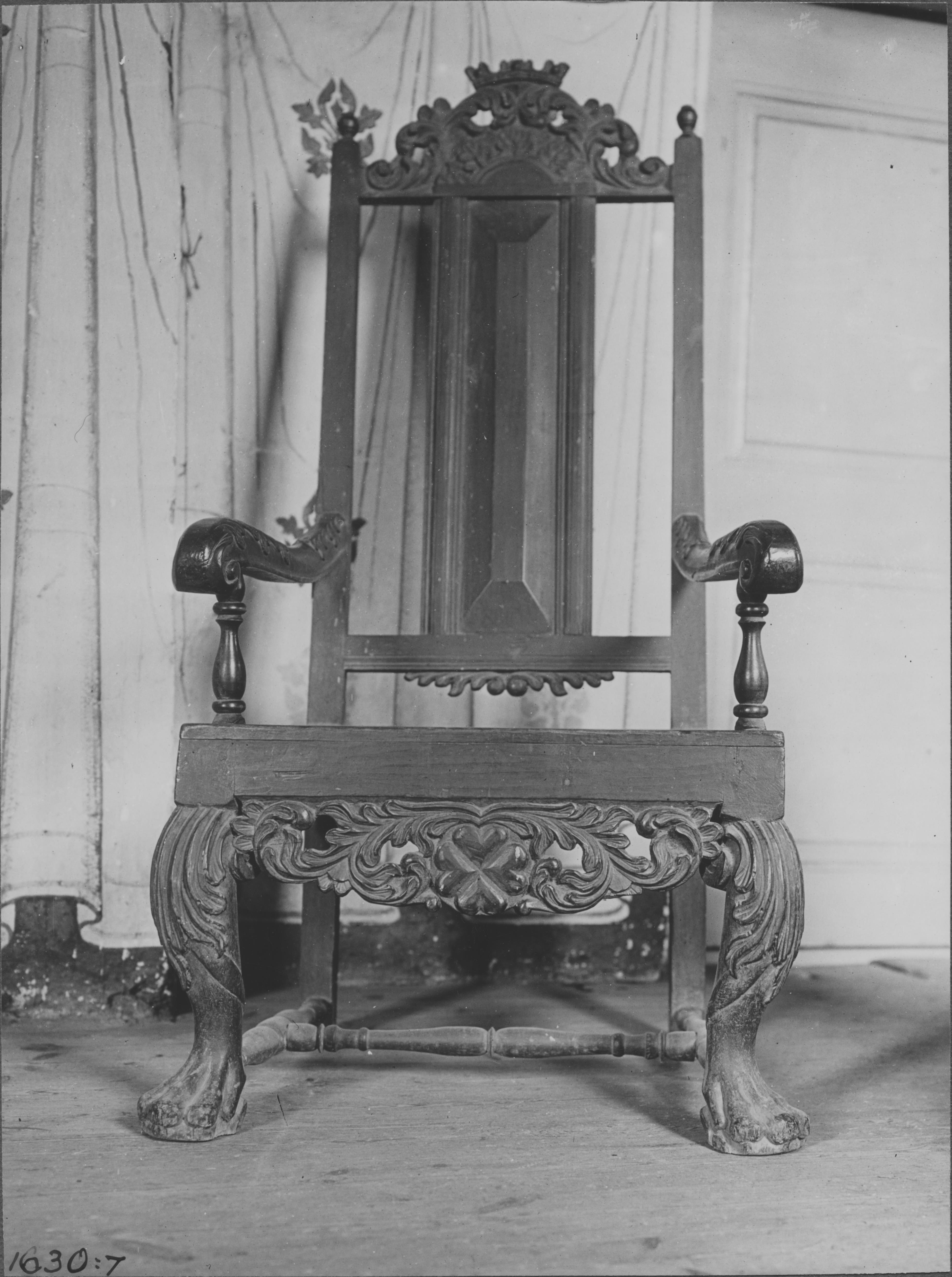 Beskrivning: Länsstol av trä. Rygg med snidadeöverstycken med bladrankor och kronor överst.