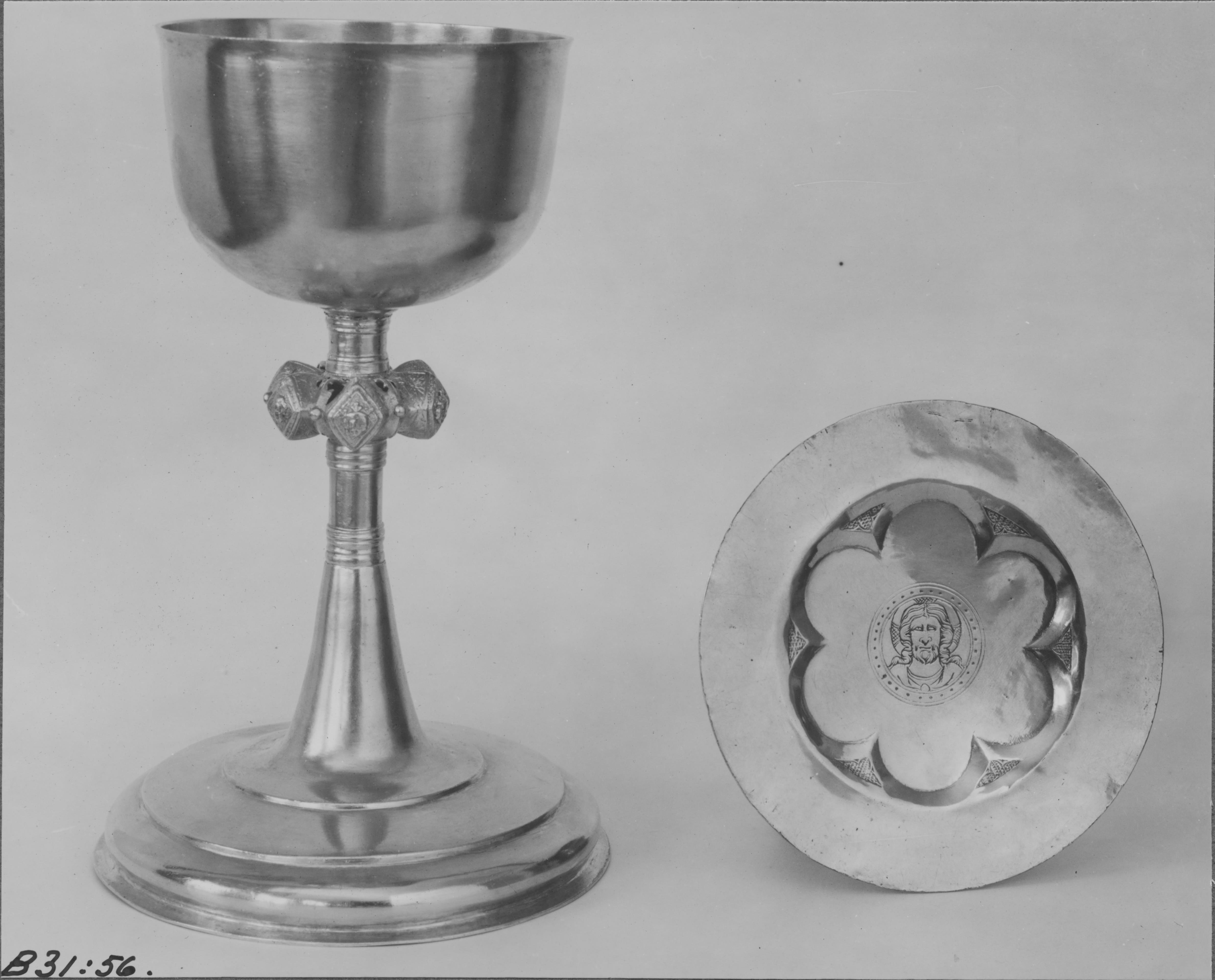 Beskrivning: Kalk och paten av förgyllt silver. Kalkens nod och patenens mittparti från 1300-talets andra fjärdedel, övriga delar från 1694.