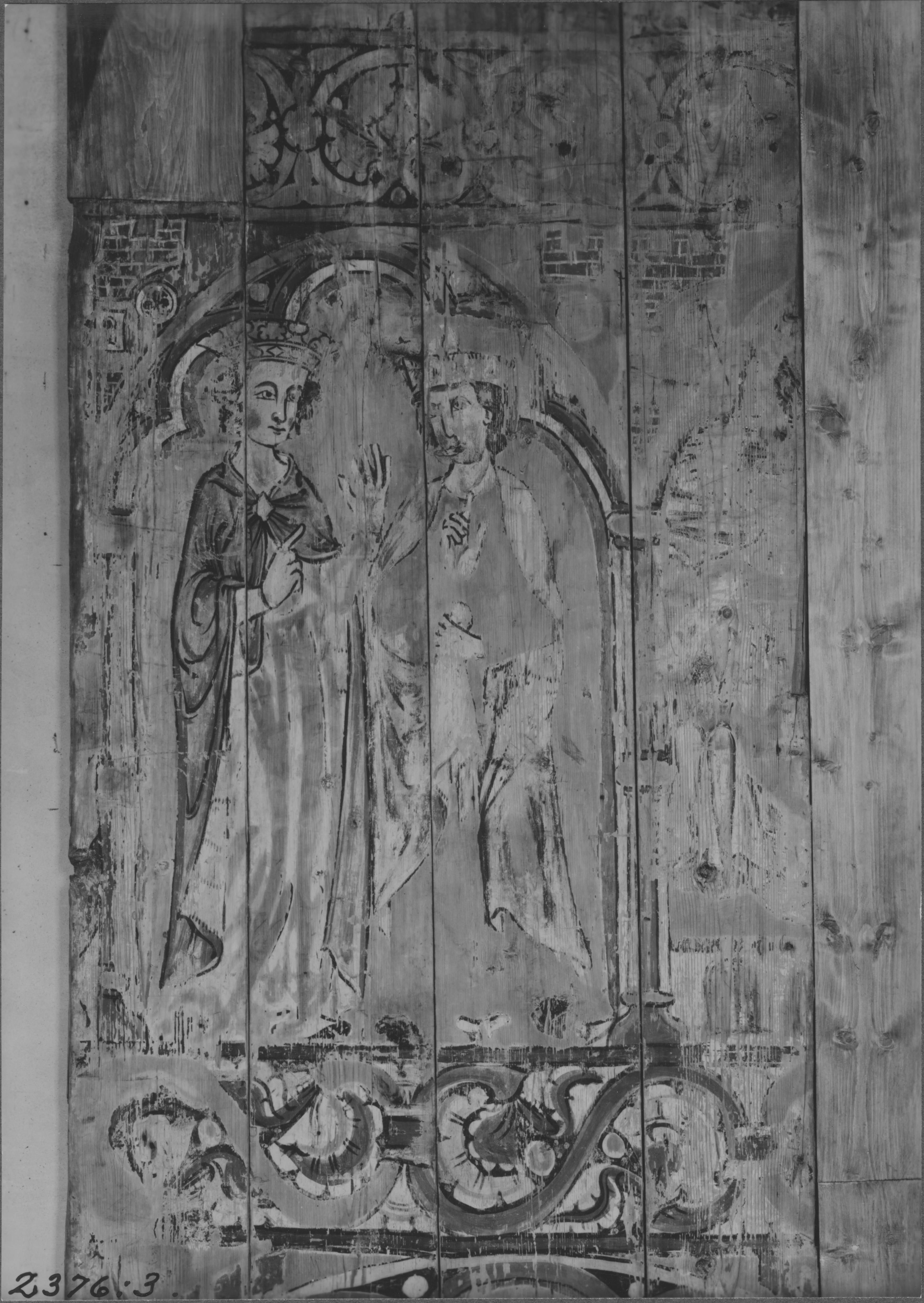Beskrivning: Del av målad väggpanel. Helga korsets saga. Tvisten mellan kejsarna Konstantin och Maxentius.