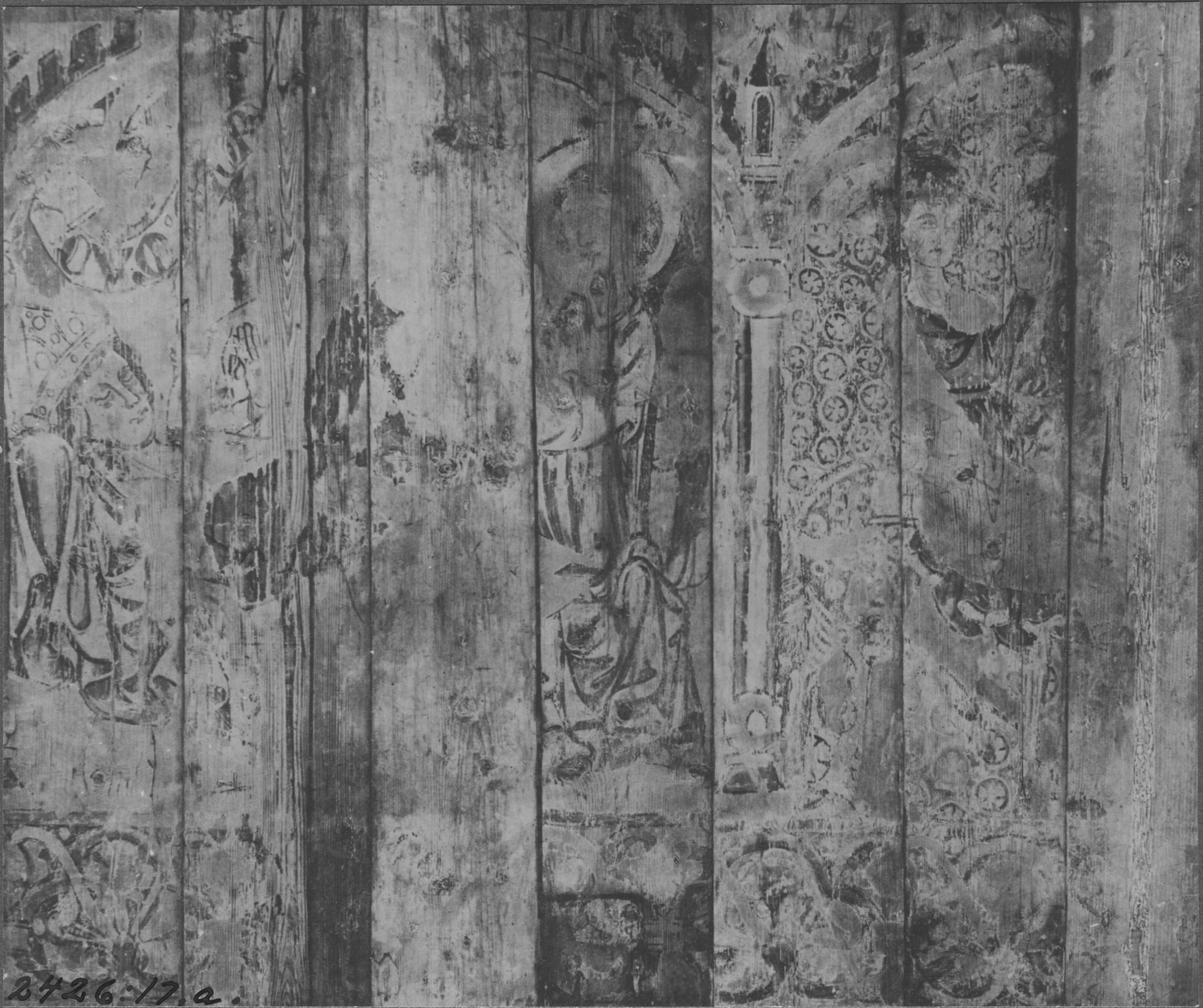 Beskrivning: Del av målad väggpanel. Thomas Beckets historia. S:t Thomas på sjukbädden.