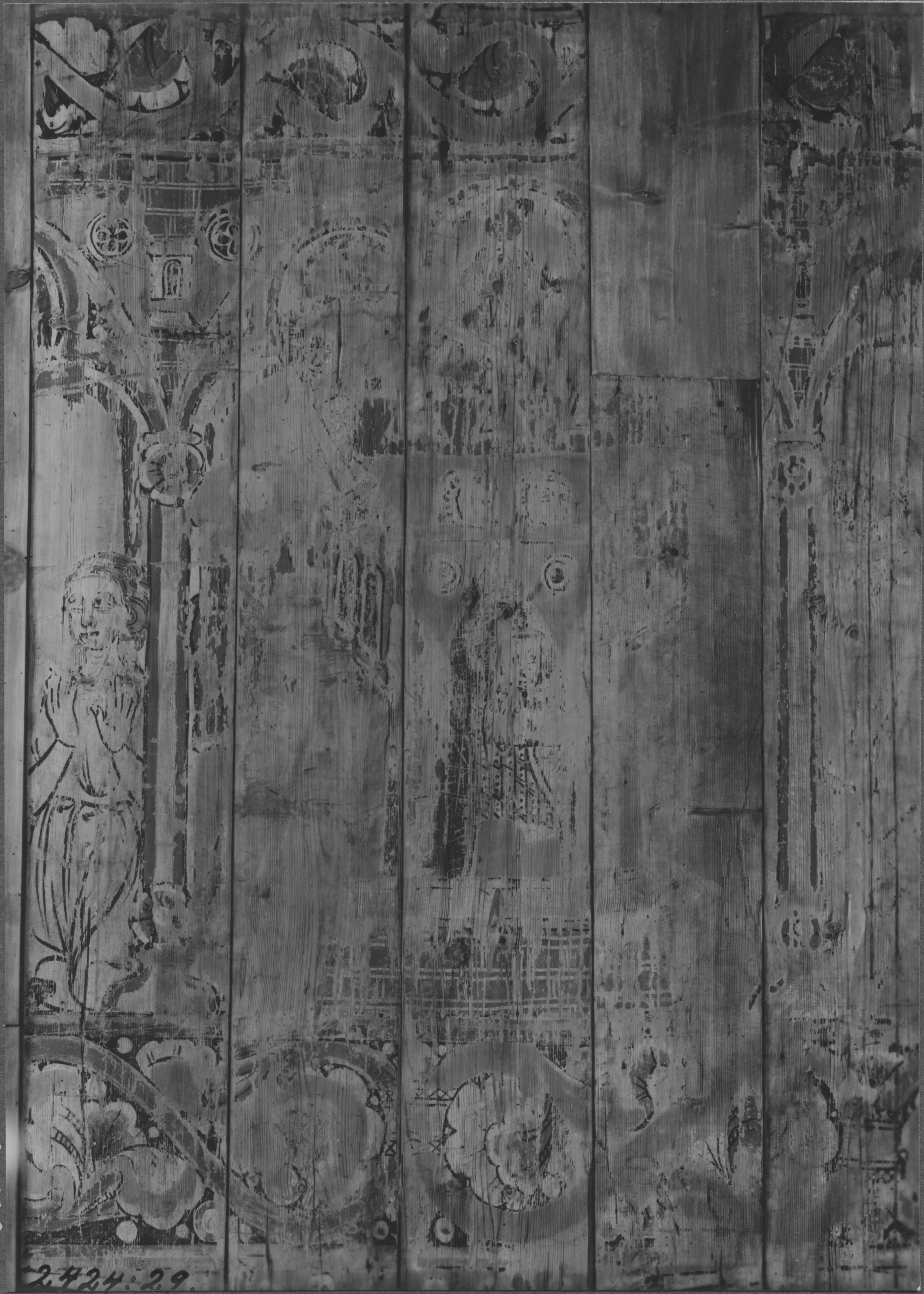 Beskrivning: Del av målad väggpanel. Helga kors saga. Kristi kors gör underverk; en sjuk kvinna botas. Under mittarkaden erövringen av Siz.
