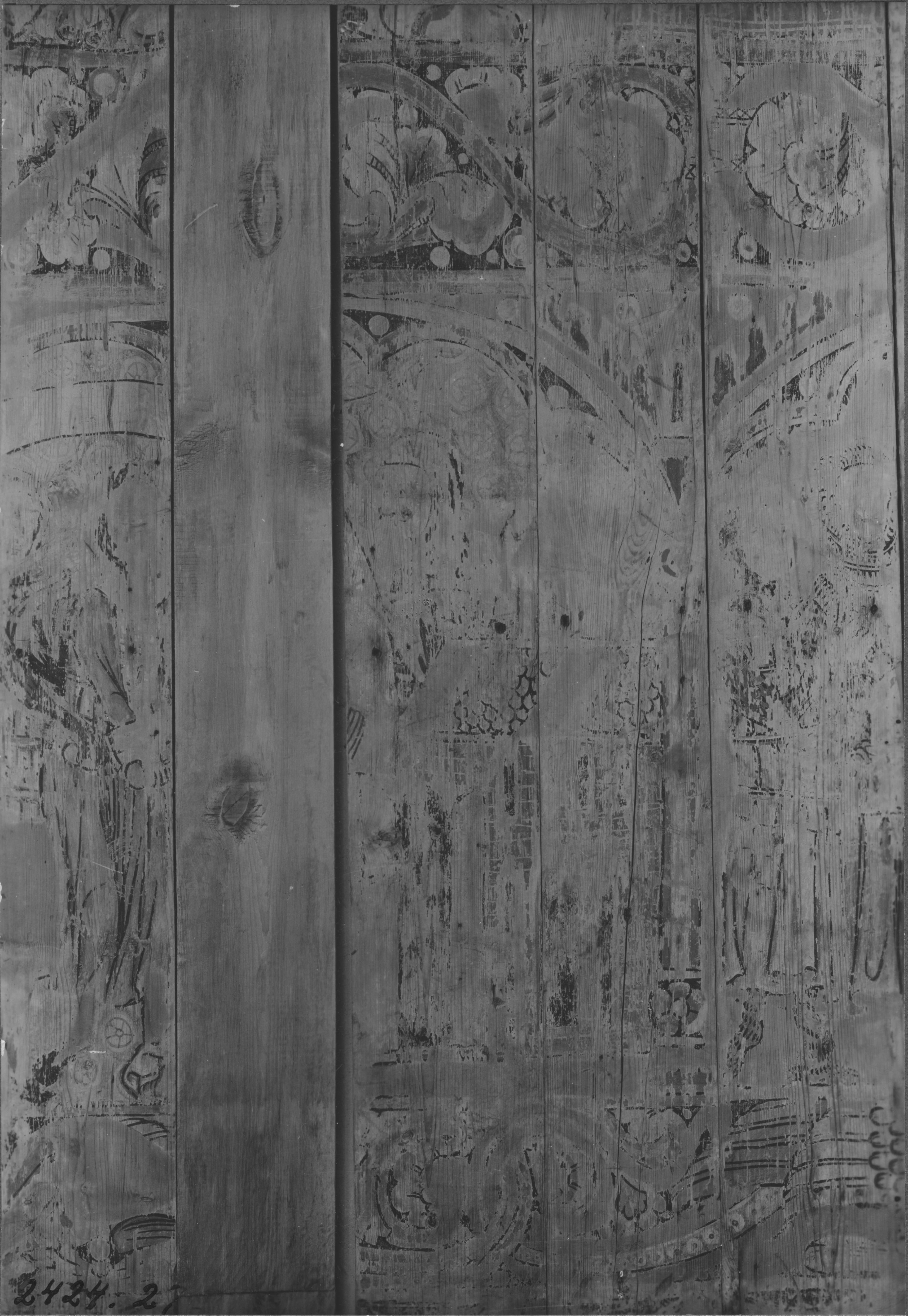 Beskrivning: Del av målad väggpanel. Thomas Beckets historia. Mordet i katedralen.