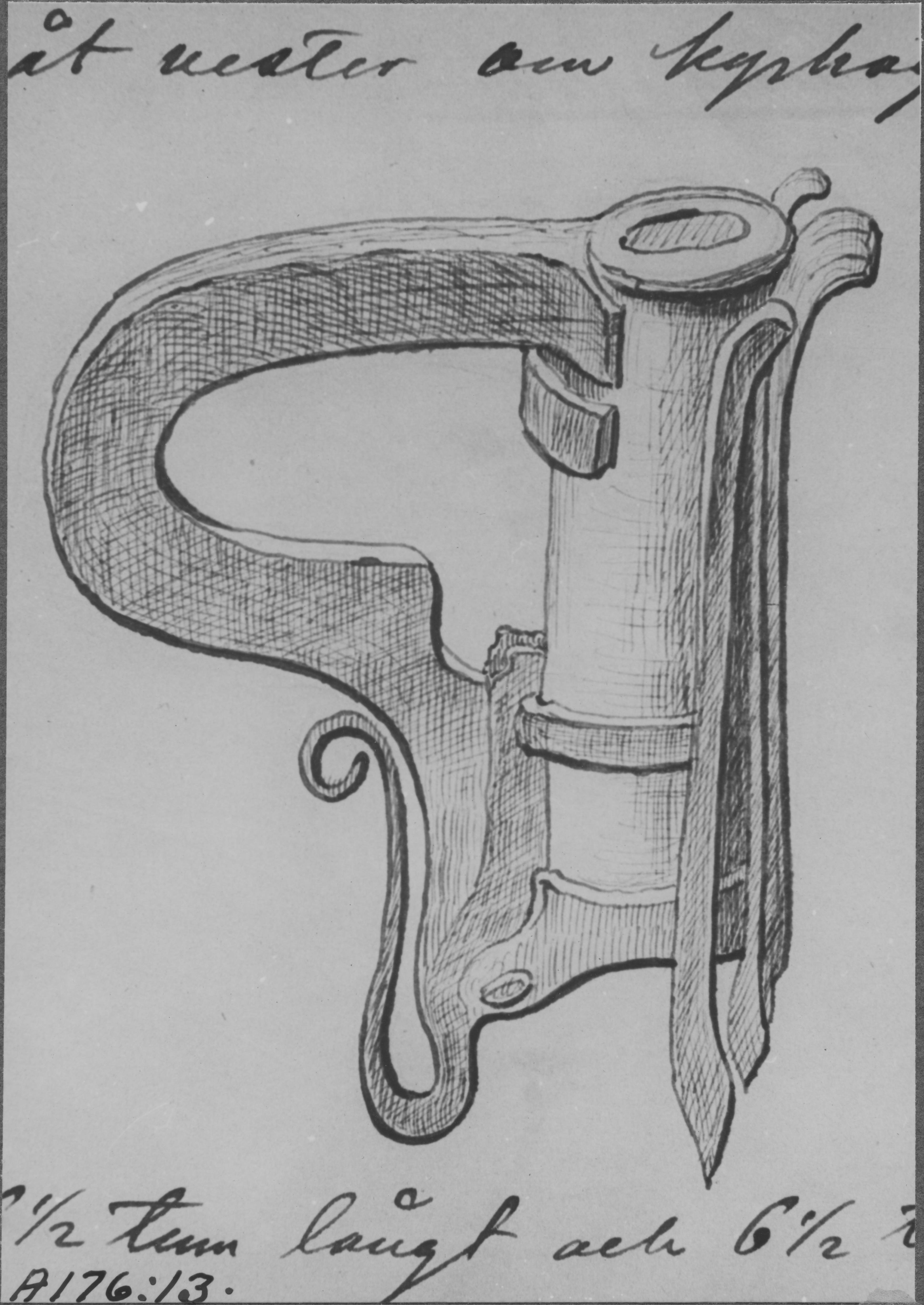 Beskrivning: Teckning av lås på kyrkomagasinets dörr. Ur P.A. Säve, 1862.