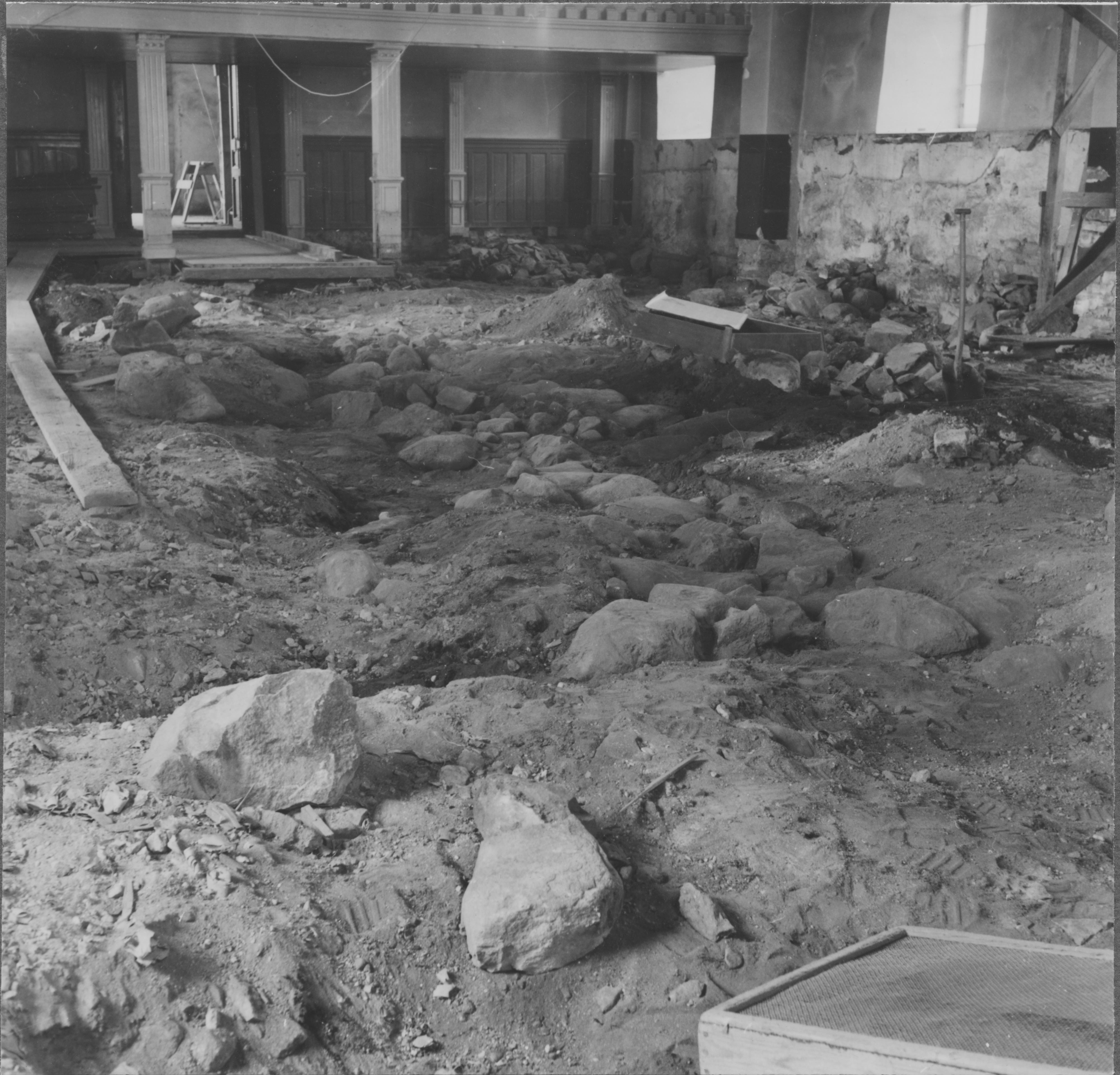 Beskrivning: Romanska kyrkans norra grundmur; till höger 1300-talskorets norra grundmur.